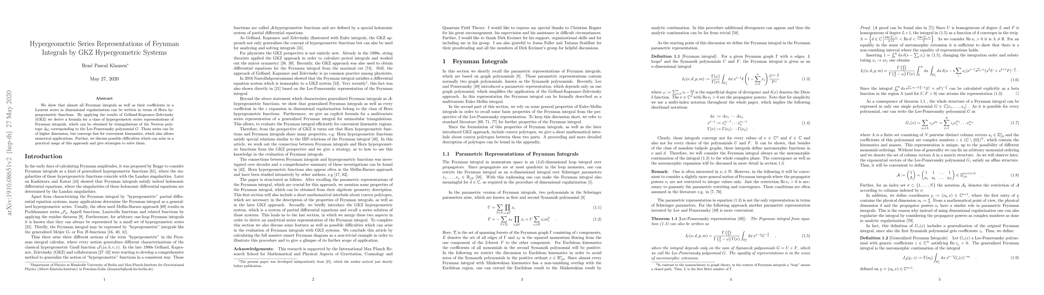 The paper demonstrates that Feynman integrals and their coefficients can be represented using Horn hypergeometric functions from GKZ theory. It presents a formula for hypergeometric series representations derived from triangulations of the Newton polytope, facilitating both theoretical and numerical applications despite potential practical difficulties.