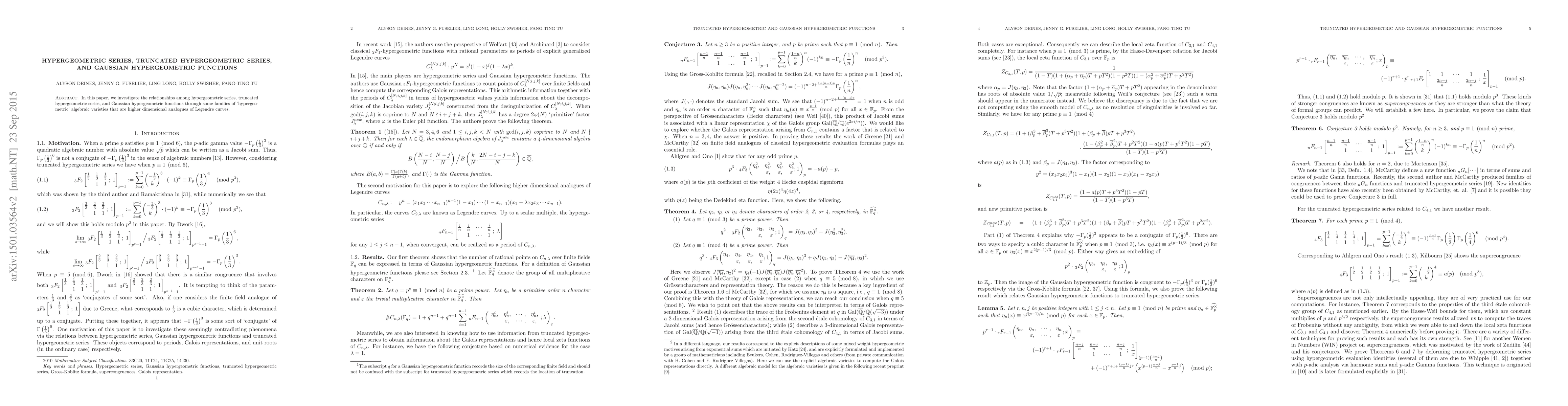 Summary: This research explores the connections between hypergeometric series, truncated hypergeometric series, and Gaussian hypergeometric functions via families of higher-dimensional algebraic varieties analogous to Legendre curves. The study aims to elucidate the relationships among these mathematical constructs.