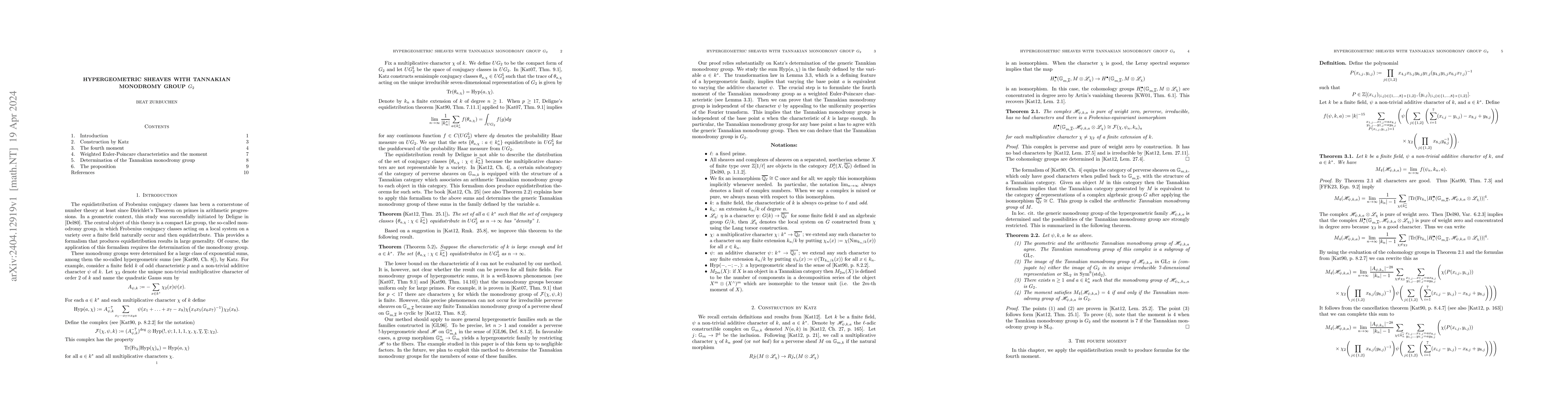 This paper determines the monodromy group of a hypergeometric sum to be $G_2$, utilizing Katz's uniformity results via Fourier transform to deduce the Tannakian monodromy group. The methodology combines advanced algebraic geometry with number theory insights.