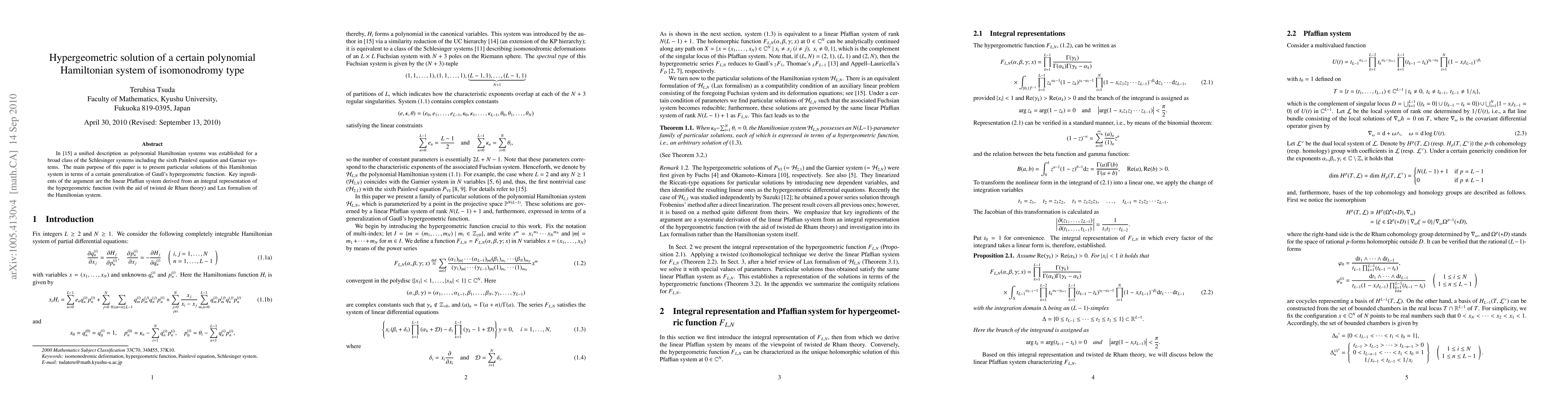 In our previous work, a unified description as polynomial Hamiltonian systems was established for a broad class of the Schlesinger systems including the sixth Painleve equation and Garnier systems. The main purpose of this paper is to present particular solutions of this Hamiltonian system in terms of a certain generalization of Gauss' hypergeometric function. Key ingredients of the argument are the linear Pfaffian system derived from an integral representation of the hypergeometric function (with the aid of twisted de Rham theory) and Lax formalism of the Hamiltonian system.