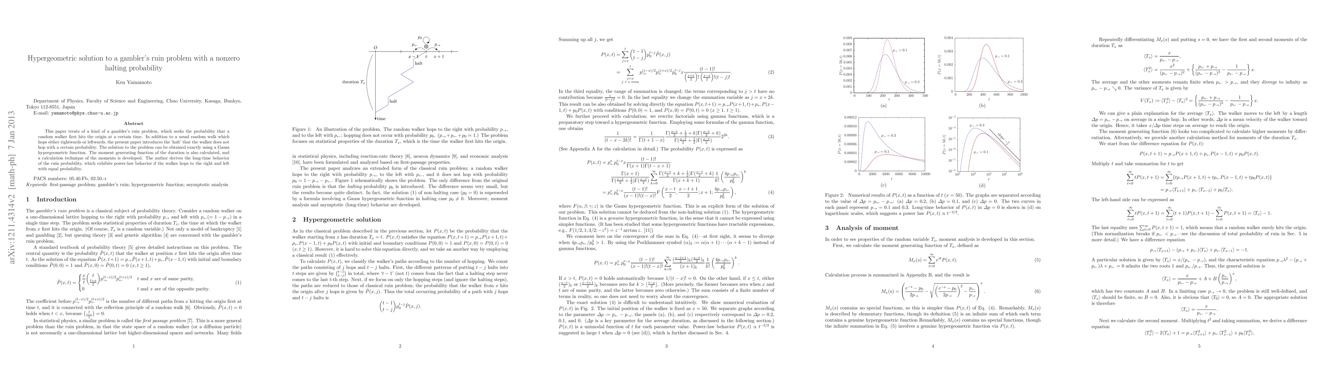 This paper solves a gambler's ruin problem with a halting probability using a Gauss hypergeometric function, deriving the exact probability of the walker hitting the origin and calculating the moment generating function of the duration. It also develops a technique for calculating moments and finds power-law behavior in the long-time ruin probability.
