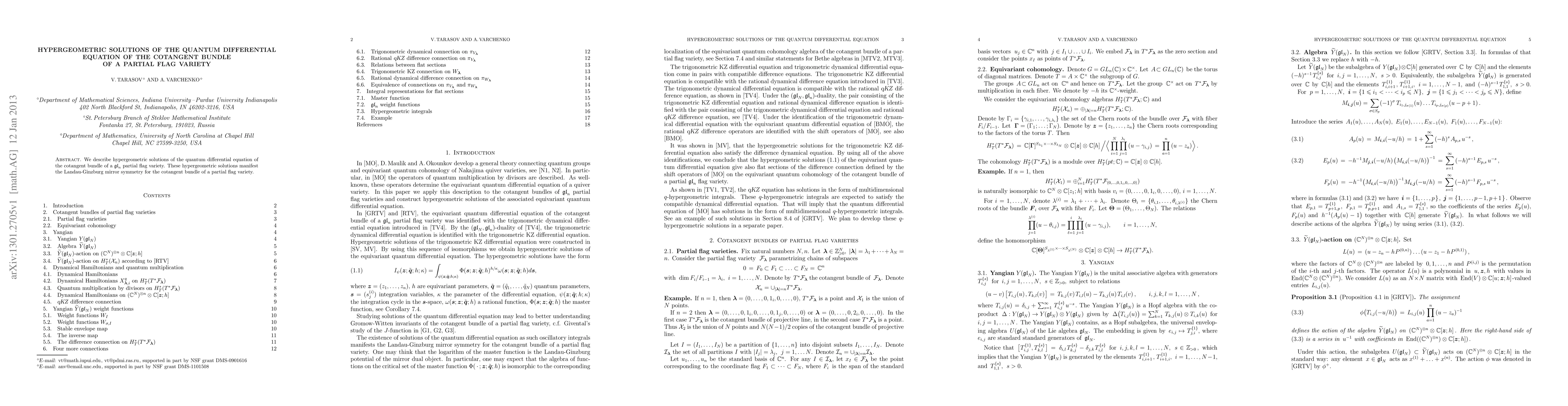 Summary: This paper explores hypergeometric solutions to the quantum differential equation on the cotangent bundle of a gl_n partial flag variety, revealing their role in demonstrating Landau-Ginzburg mirror symmetry.
