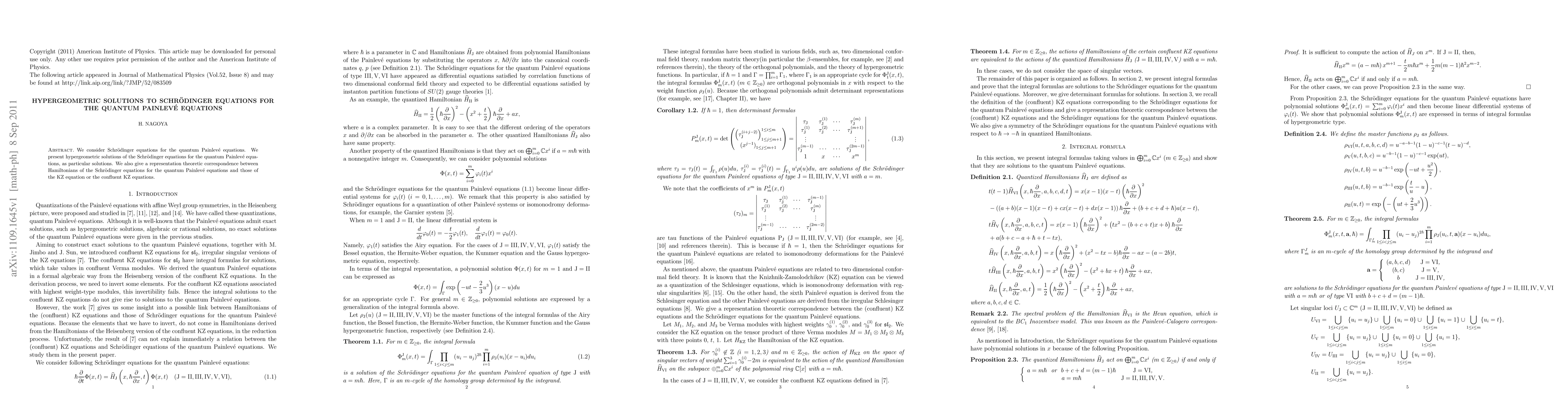 This paper presents hypergeometric solutions to Schrödinger equations associated with quantum Painlevé equations and establishes a representation-theoretic link between their Hamiltonians and those of the KZ equation or its confluent versions.