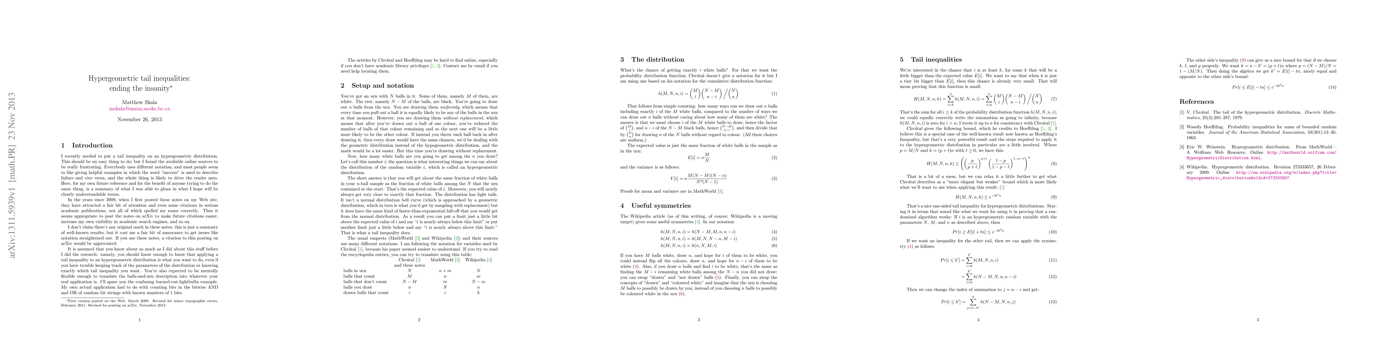 The hypergeometric distribution is briefly and informally surveyed, including popular notation, symmetries, and the tail inequalities $Pr[i \ge E[i]+tn] \le e^{-2t^2n}$ and $Pr[i \le E[i]-tn] \le e^{-2t^2n}$.
