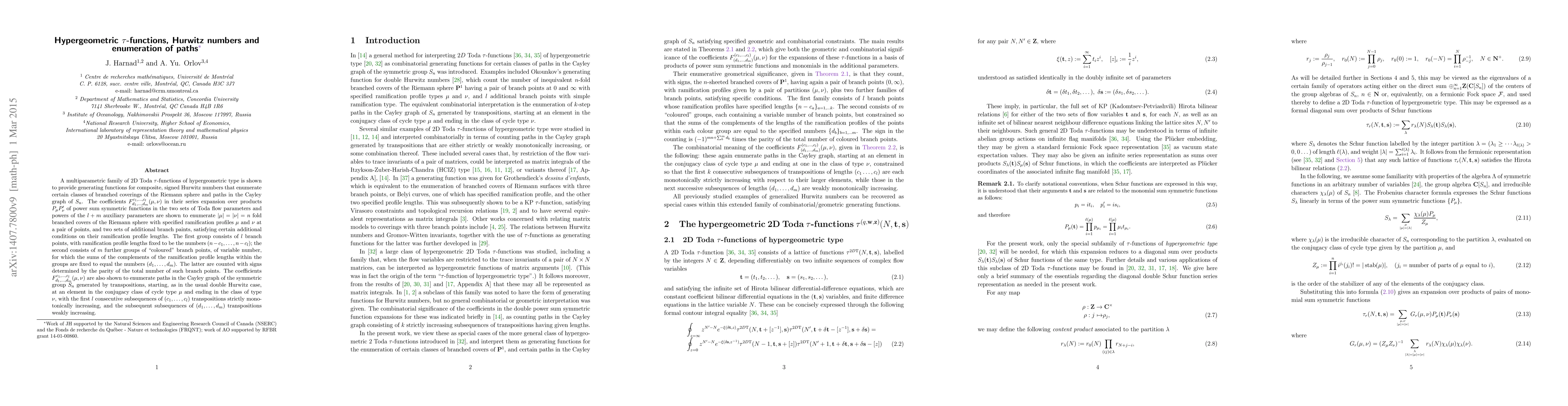 A multiparametric family of 2D Toda $\tau$-functions of hypergeometric type is shown to provide generating functions for composite, signed Hurwitz numbers that enumerate certain classes of branched coverings of the Riemann sphere and paths in the Cayley graph of $S_n$. The coefficients $F^{c_1, ..., c_l}_{d_1, ..., d_m}(\mu, \nu)$ in their series expansion over products $P_\mu P'_\nu$ of power sum symmetric functions in the two sets of Toda flow parameters and powers of the $l+m$ auxiliary parameters are shown to enumerate $|\mu|=|\nu|=n$ fold branched covers of the Riemann sphere with specified ramification profiles $ \mu$ and $\nu$ at a pair of points, and two sets of additional branch paints, satisfying certain additional conditions on their ramification profile lengths. The first group consists of $l$ branch points, with ramification profile lengths fixed to be the numbers $(n-c_1, ..., n- c_l)$; the second consists of $m$ further groups of "coloured" branch points, of variable number, for which the sums of the complements of the ramification profile lengths within the groups are fixed to equal the numbers $(d_1, ..., d_m)$. The latter are counted with sign determined by the parity of the total number of such branch points. The coefficients $F^{c_1, ..., c_l}_{d_1, ..., d_m}(\mu, \nu)$ are also shown to enumerate paths in the Cayley graph of the symmetric group $S_n$ generated by transpositions, starting, as in the usual double Hurwitz case, at an element in the conjugacy class of cycle type $\mu$ and ending in the class of type $\nu$, but with the first $l$ consecutive subsequences of $(c_1, ..., c_l)$ transpositions strictly monotonically increasing, and the subsequent subsequences of $(d_1, ..., d_m)$ transpositions weakly increasing.