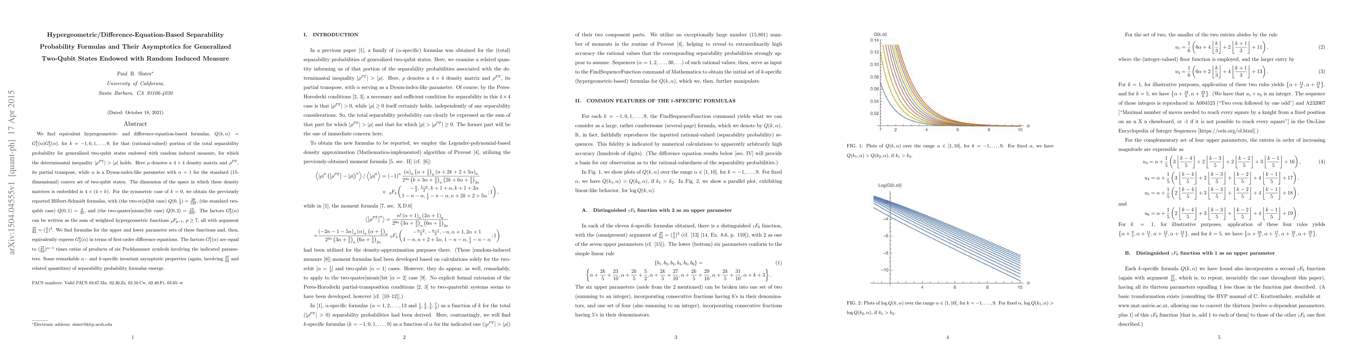 This paper develops hypergeometric and difference-equation-based formulas for the separability probability of generalized two-qubit states with random induced measure, focusing on the determinantal inequality $|\rho^{PT}| >|\rho|$. The study reveals specific formulas for $Q(k,\alpha)$ and highlights invariant asymptotic properties, particularly for $k=0$ and $\alpha=1, \frac{1}{2}, 2$.
