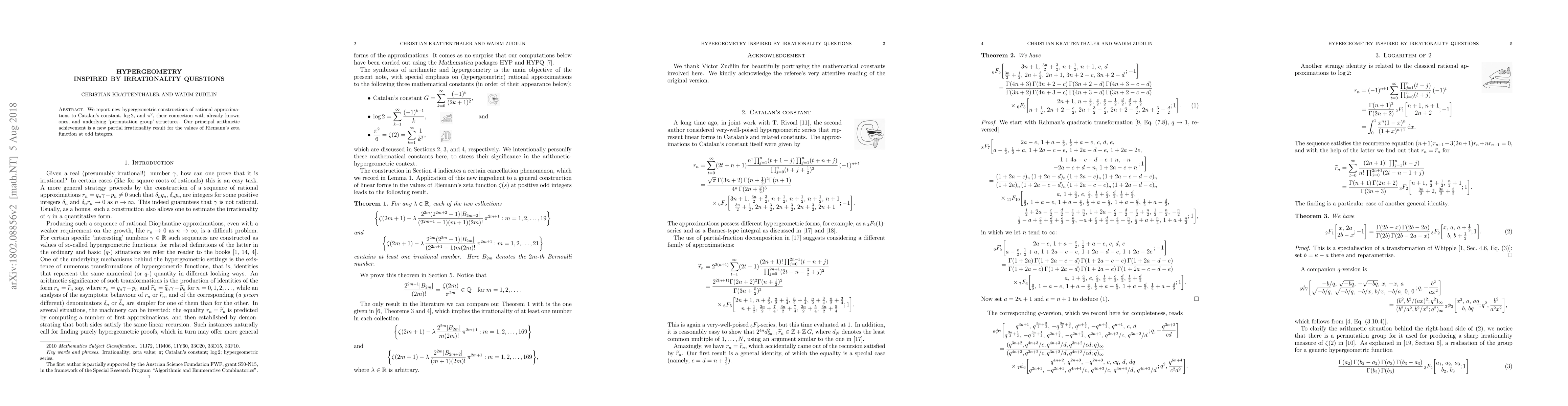 This paper introduces novel hypergeometric constructions for rational approximations of Catalan's constant, $\log2$, and $\pi^2$, linking them to existing methods and highlighting underlying permutation group structures. The main arithmetic contribution is a new partial irrationality result for the values of Riemann's zeta function at odd integers.