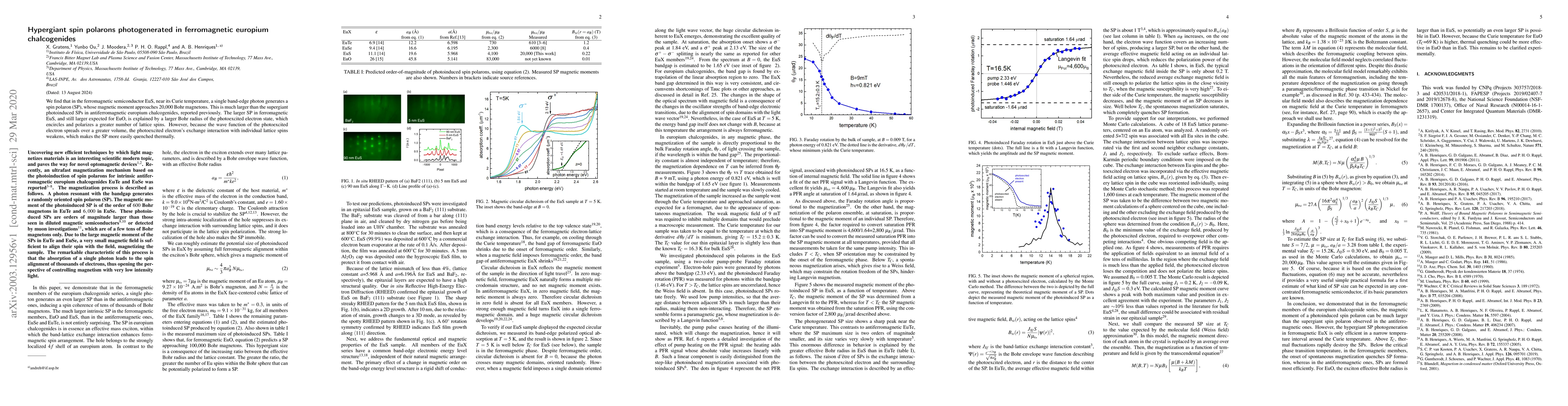 We find that in the ferromagnetic semiconductor EuS, near its Curie temperature, a single band-edge photon generates a spin polaron (SP), whose magnetic moment approaches 20,000 Bohr magnetons. This is much larger than the supergiant photoinduced SPs in antiferromagnetic europium chalcogenides, reported previously. The larger SP in ferromagnetic EuS, and still larger expected for EuO, is explained by a larger Bohr radius of the photoexcited electron state, which encircles and polarizes a greater number of lattice spins. However, because the wave function of the photoexcited electron spreads over a greater volume, the photoexcited electron exchange interaction with individual lattice spins weakens, which makes the SP more easily quenched thermally.