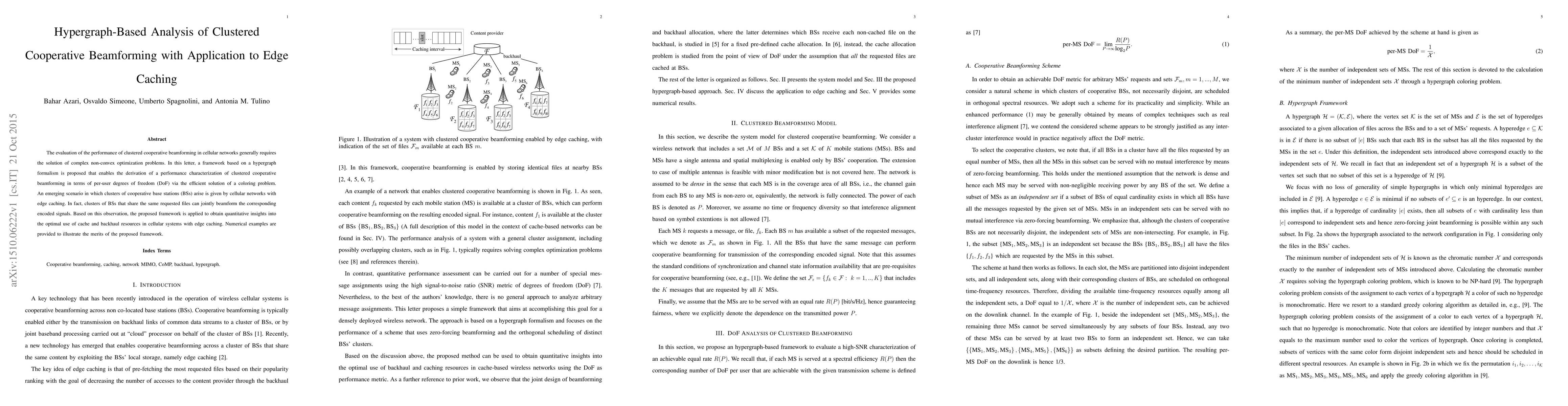 This paper proposes a hypergraph-based framework to analyze clustered cooperative beamforming, enabling efficient performance characterization via a coloring problem. The framework is applied to cellular networks with edge caching, providing insights into optimal cache and backhaul resource usage.
