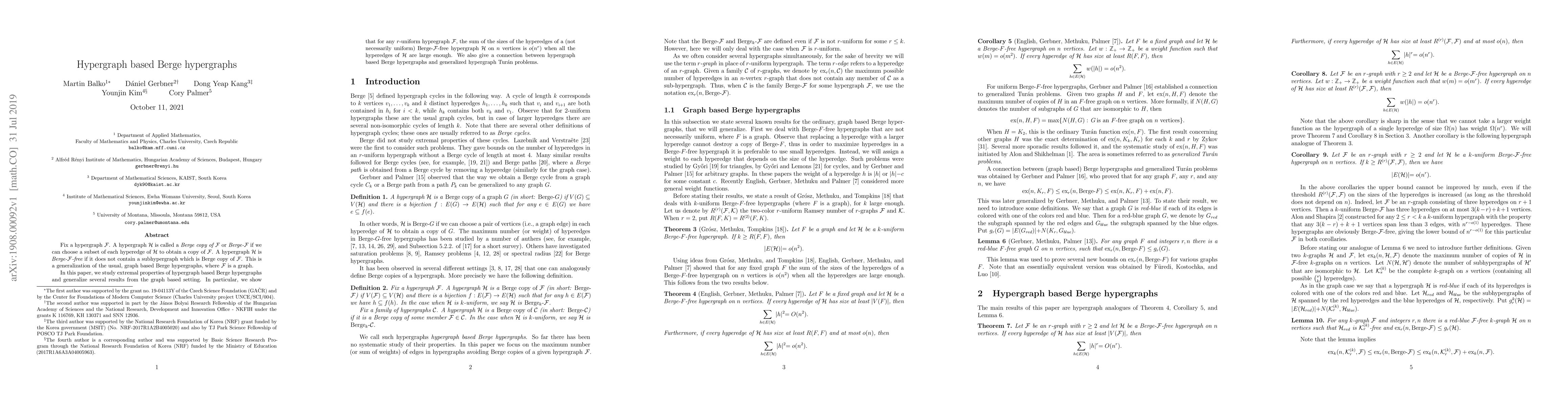Fix a hypergraph $\mathcal{F}$. A hypergraph $\mathcal{H}$ is called a {\it Berge copy of $\mathcal{F}$} or {\it Berge-$\mathcal{F}$} if we can choose a subset of each hyperedge of $\mathcal{H}$ to obtain a copy of $\mathcal{F}$. A hypergraph $\mathcal{H}$ is {\it Berge-$\mathcal{F}$-free} if it does not contain a subhypergraph which is Berge copy of $\mathcal{F}$. This is a generalization of the usual, graph based Berge hypergraphs, where $\mathcal{F}$ is a graph. In this paper, we study extremal properties of hypergraph based Berge hypergraphs and generalize several results from the graph based setting. In particular, we show that for any $r$-uniform hypregraph $\mathcal{F}$, the sum of the sizes of the hyperedges of a (not necessarily uniform) Berge-$\mathcal{F}$-free hypergraph $\mathcal{H}$ on $n$ vertices is $o(n^r)$ when all the hyperedges of $\mathcal{H}$ are large enough. We also give a connection between hypergraph based Berge hypergraphs and generalized hypergraph Tur\'an problems.