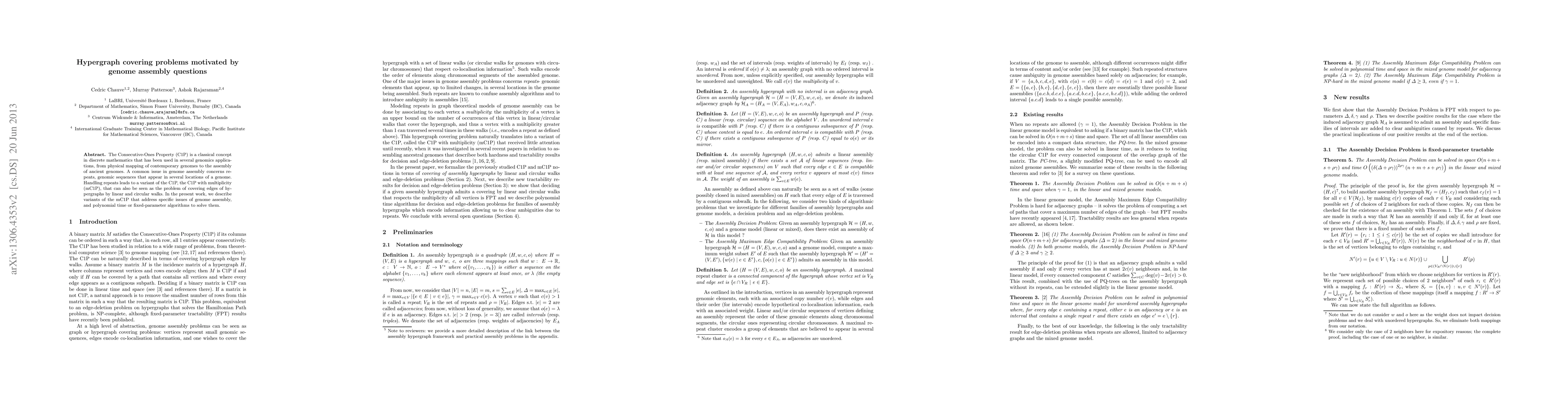 The Consecutive-Ones Property (C1P) is a classical concept in discrete mathematics that has been used in several genomics applications, from physical mapping of contemporary genomes to the assembly of ancient genomes. A common issue in genome assembly concerns repeats, genomic sequences that appear in several locations of a genome. Handling repeats leads to a variant of the C1P, the C1P with multiplicity (mC1P), that can also be seen as the problem of covering edges of hypergraphs by linear and circular walks. In the present work, we describe variants of the mC1P that address specific issues of genome assembly, and polynomial time or fixed-parameter algorithms to solve them.