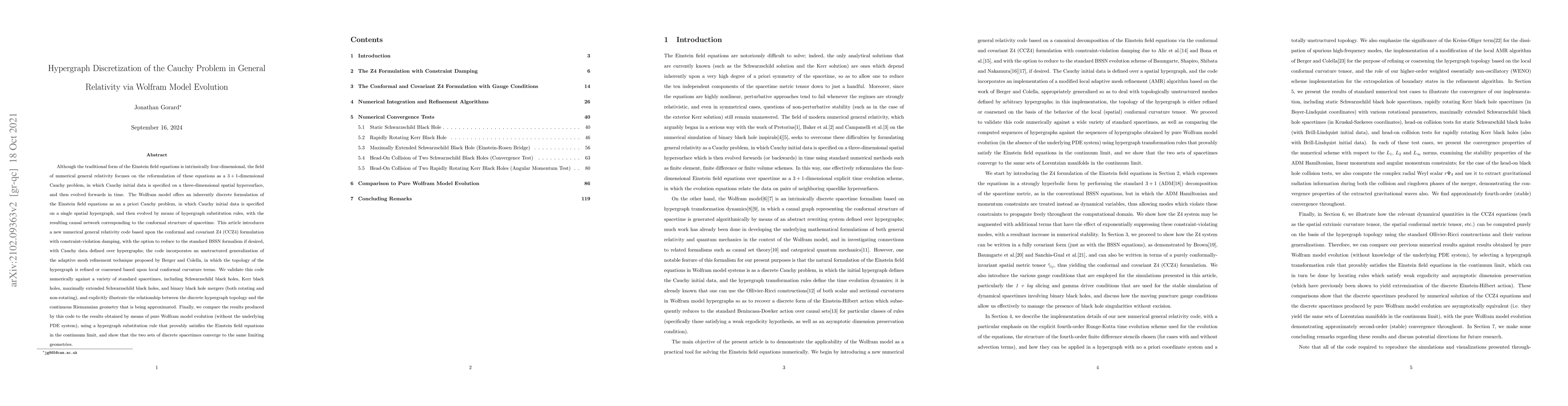 Although the traditional form of the Einstein field equations is intrinsically four-dimensional, the field of numerical general relativity focuses on the reformulation of these equations as a 3 + 1-dimensional Cauchy problem, in which Cauchy initial data is specified on a three-dimensional spatial hypersurface, and then evolved forwards in time. The Wolfram model offers an inherently discrete formulation of the Einstein field equations as an a priori Cauchy problem, in which Cauchy initial data is specified on a single spatial hypergraph, and then evolved by means of hypergraph substitution rules, with the resulting causal network corresponding to the conformal structure of spacetime. This article introduces a new numerical general relativity code based upon the conformal and covariant Z4 (CCZ4) formulation with constraint-violation damping, with the option to reduce to the standard BSSN formalism if desired, with Cauchy data defined over hypergraphs; the code incorporates an unstructured generalization of the adaptive mesh refinement technique proposed by Berger and Colella, in which the topology of the hypergraph is refined or coarsened based upon local conformal curvature terms. We validate this code numerically against a variety of standard spacetimes, including Schwarzschild black holes, Kerr black holes, maximally extended Schwarzschild black holes, and binary black hole mergers (both rotating and non-rotating), and explicitly illustrate the relationship between the discrete hypergraph topology and the continuous Riemannian geometry that is being approximated. Finally, we compare the results produced by this code to the results obtained by means of pure Wolfram model evolution (without the underlying PDE system), using a hypergraph substitution rule that provably satisfies the Einstein field equations in the continuum limit.