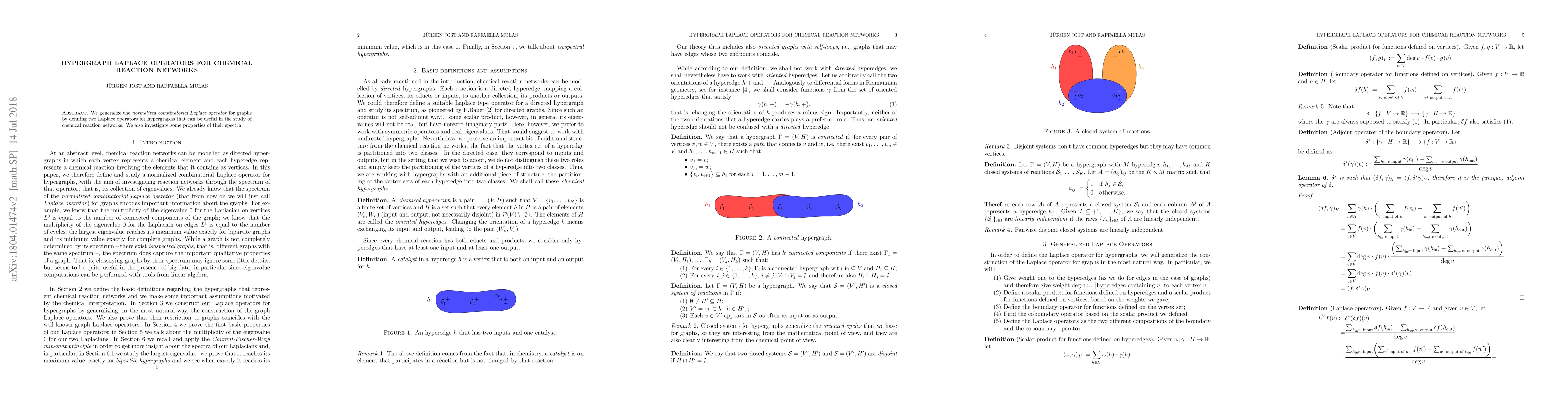 This paper generalizes the normalized combinatorial Laplace operator for graphs to hypergraphs, defining two new Laplace operators that are applicable to the study of chemical reaction networks. The study also examines the spectral properties of these operators.