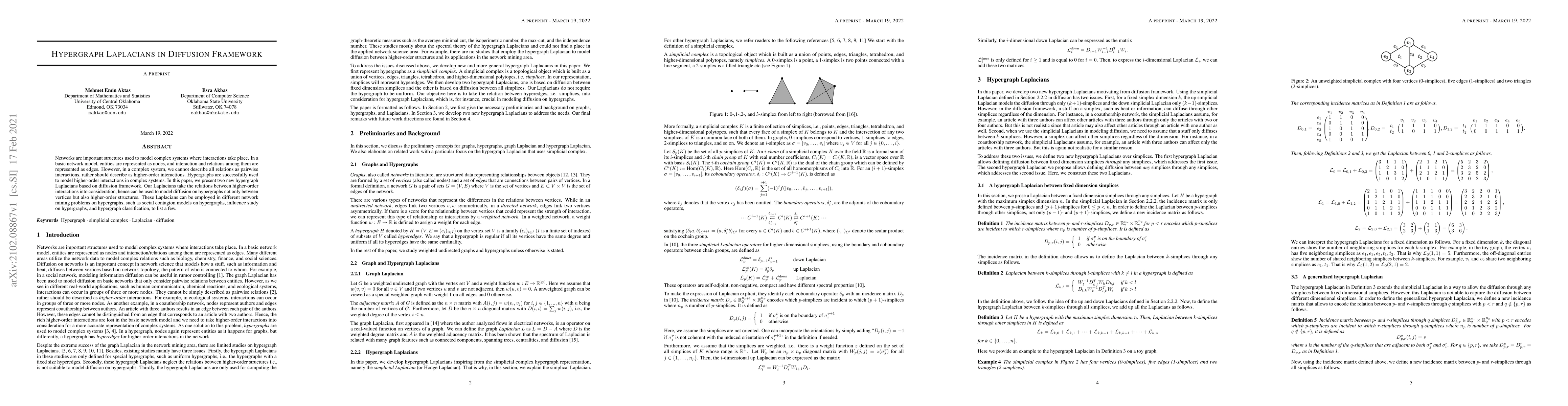 Networks are important structures used to model complex systems where interactions take place. In a basic network model, entities are represented as nodes, and interaction and relations among them are represented as edges. However, in a complex system, we cannot describe all relations as pairwise interactions, rather should describe as higher-order interactions. Hypergraphs are successfully used to model higher-order interactions in complex systems. In this paper, we present two new hypergraph Laplacians based on diffusion framework. Our Laplacians take the relations between higher-order interactions into consideration, hence can be used to model diffusion on hypergraphs not only between vertices but also higher-order structures. These Laplacians can be employed in different network mining problems on hypergraphs, such as social contagion models on hypergraphs, influence study on hypergraphs, and hypergraph classification, to list a few.