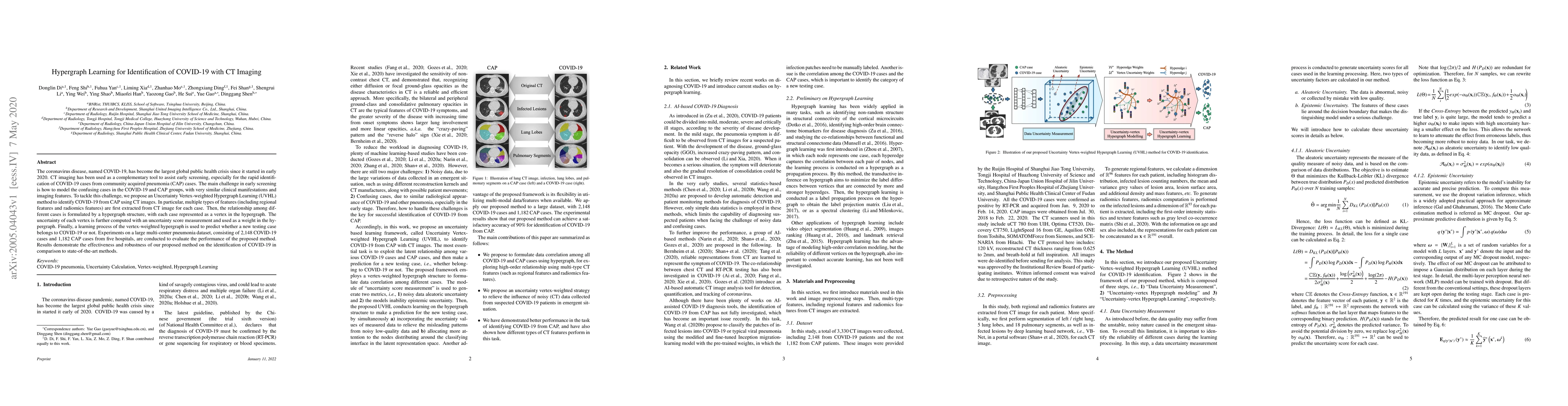 The paper proposes an Uncertainty Vertex-weighted Hypergraph Learning (UVHL) method to distinguish COVID-19 from community-acquired pneumonia (CAP) using CT imaging. The method extracts multiple features from CT images and uses a hypergraph structure to model relationships among cases, with uncertainty scores as vertex weights, achieving effective identification of COVID-19.