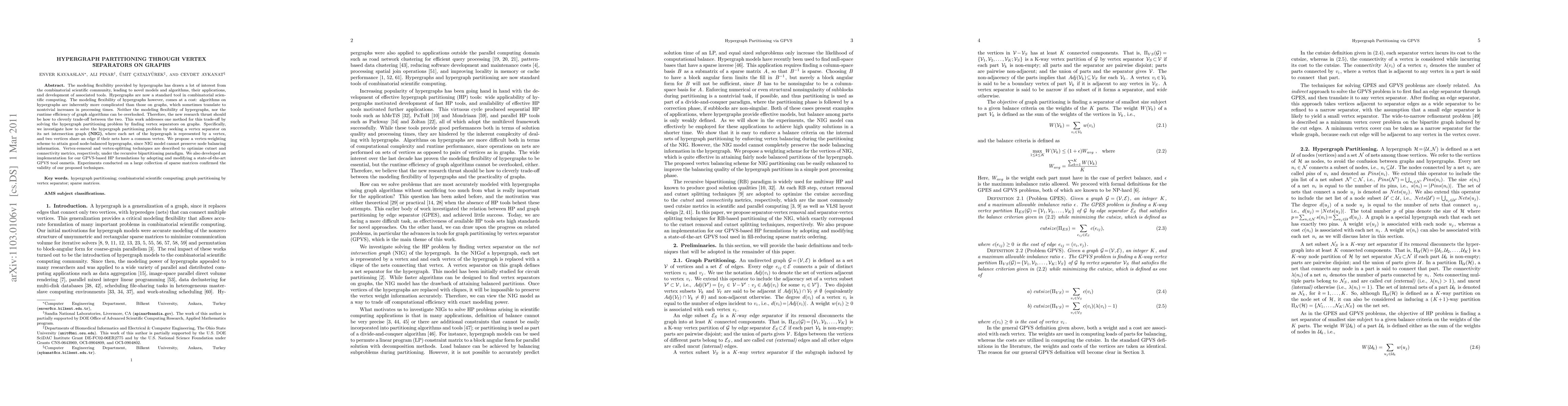 The modeling flexibility provided by hypergraphs has drawn a lot of interest from the combinatorial scientific community, leading to novel models and algorithms, their applications, and development of associated tools. Hypergraphs are now a standard tool in combinatorial scientific computing. The modeling flexibility of hypergraphs however, comes at a cost: algorithms on hypergraphs are inherently more complicated than those on graphs, which sometimes translate to nontrivial increases in processing times. Neither the modeling flexibility of hypergraphs, nor the runtime efficiency of graph algorithms can be overlooked. Therefore, the new research thrust should be how to cleverly trade-off between the two. This work addresses one method for this trade-off by solving the hypergraph partitioning problem by finding vertex separators on graphs. Specifically, we investigate how to solve the hypergraph partitioning problem by seeking a vertex separator on its net intersection graph (NIG), where each net of the hypergraph is represented by a vertex, and two vertices share an edge if their nets have a common vertex. We propose a vertex-weighting scheme to attain good node-balanced hypergraphs, since NIG model cannot preserve node balancing information. Vertex-removal and vertex-splitting techniques are described to optimize cutnet and connectivity metrics, respectively, under the recursive bipartitioning paradigm. We also developed an implementation for our GPVS-based HP formulations by adopting and modifying a state-of-the-art GPVS tool onmetis. Experiments conducted on a large collection of sparse matrices confirmed the validity of our proposed techniques.