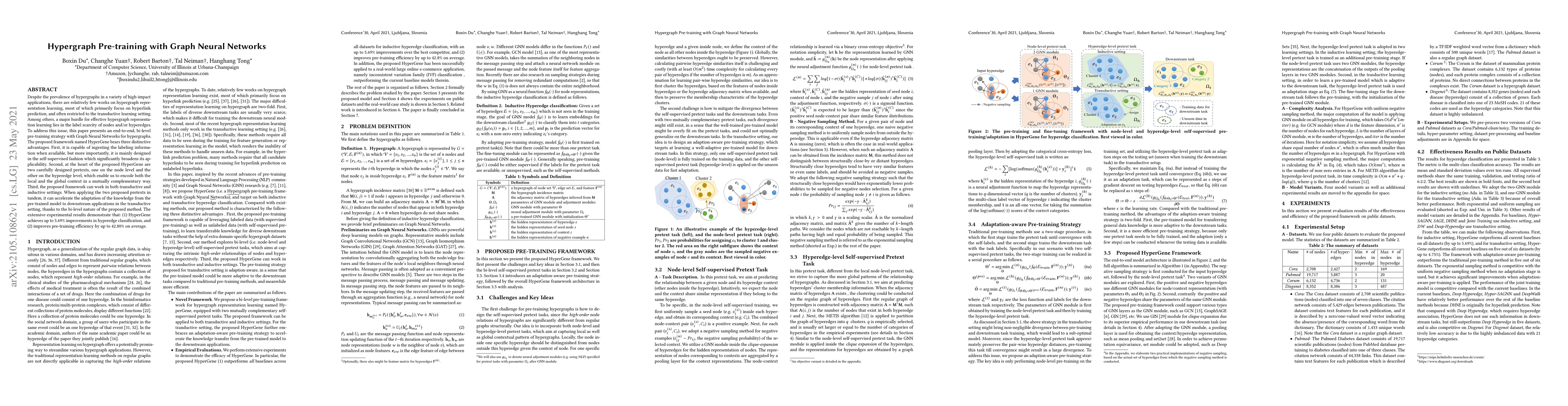 Despite the prevalence of hypergraphs in a variety of high-impact applications, there are relatively few works on hypergraph representation learning, most of which primarily focus on hyperlink prediction, often restricted to the transductive learning setting. Among others, a major hurdle for effective hypergraph representation learning lies in the label scarcity of nodes and/or hyperedges. To address this issue, this paper presents an end-to-end, bi-level pre-training strategy with Graph Neural Networks for hypergraphs. The proposed framework named HyperGene bears three distinctive advantages. First, it is capable of ingesting the labeling information when available, but more importantly, it is mainly designed in the self-supervised fashion which significantly broadens its applicability. Second, at the heart of the proposed HyperGene are two carefully designed pretexts, one on the node level and the other on the hyperedge level, which enable us to encode both the local and the global context in a mutually complementary way. Third, the proposed framework can work in both transductive and inductive settings. When applying the two proposed pretexts in tandem, it can accelerate the adaptation of the knowledge from the pre-trained model to downstream applications in the transductive setting, thanks to the bi-level nature of the proposed method. The extensive experimental results demonstrate that: (1) HyperGene achieves up to 5.69% improvements in hyperedge classification, and (2) improves pre-training efficiency by up to 42.80% on average.