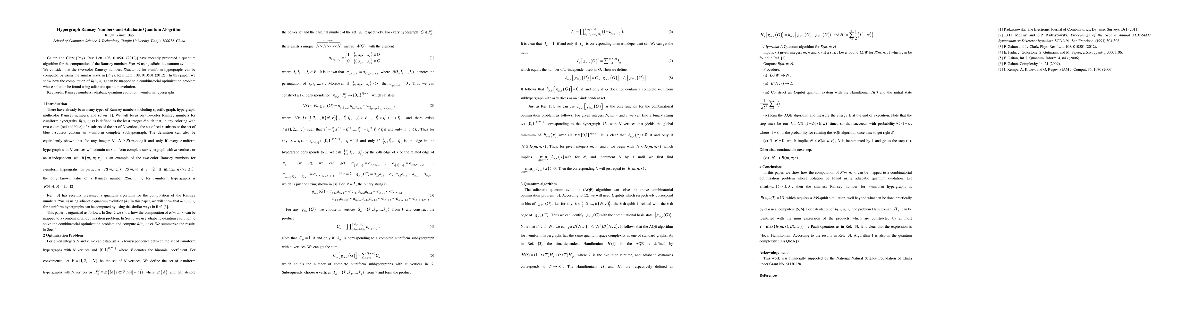 Gaitan and Clark [Phys. Rev. Lett. 108, 010501 (2012)] have recently presented a quantum algorithm for the computation of the Ramsey numbers R(m, n) using adiabatic quantum evolution. We consider that the two-color Ramsey numbers R(m, n; r) for r-uniform hypergraphs can be computed by using the similar ways in [Phys. Rev. Lett. 108, 010501 (2012)]. In this comment, we show how the computation of R(m, n; r) can be mapped to a combinatorial optimization problem whose solution be found using adiabatic quantum evolution.