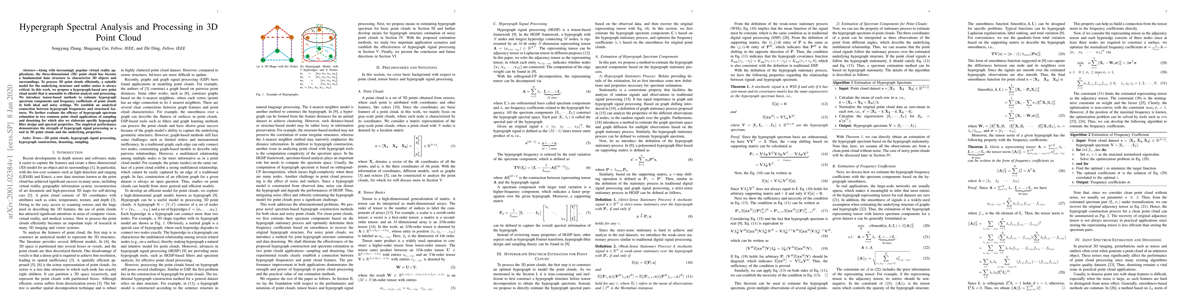 This paper proposes a hypergraph-based model for 3D point cloud analysis, introducing tensor-based methods for spectrum estimation and frequency coefficient calculation. It demonstrates the model's effectiveness in point cloud sampling and denoising applications through empirical evaluation.