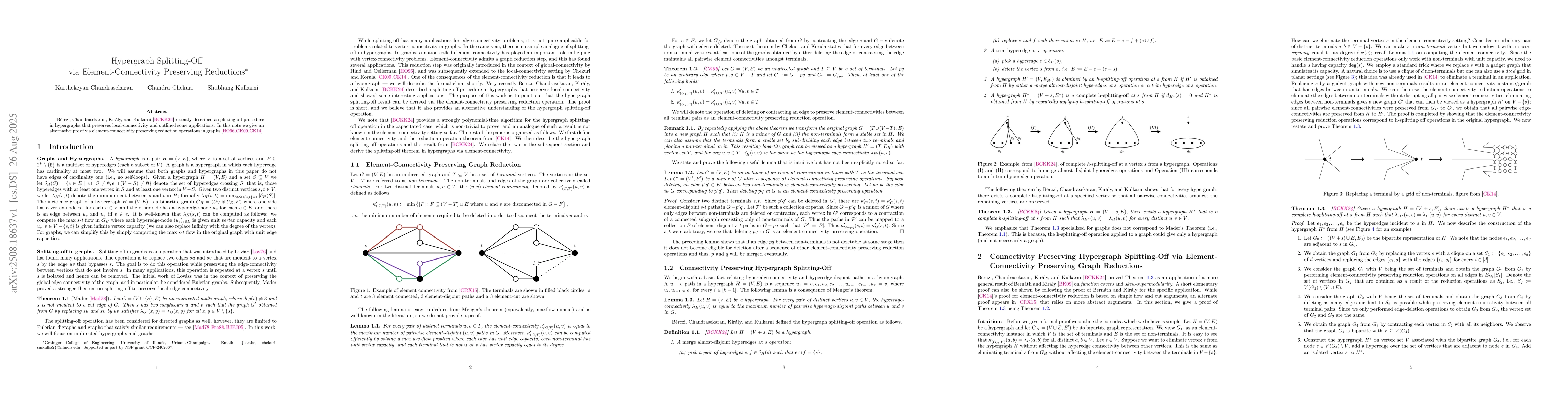 B\'erczi, Chandrasekaran, Kir\'aly, and Kulkarni (ICALP 2024) recently described a splitting-off procedure in hypergraphs that preserves local-connectivity and outlined some applications. In this note we give an alternative proof via element-connectivity preserving reduction operations in graphs.