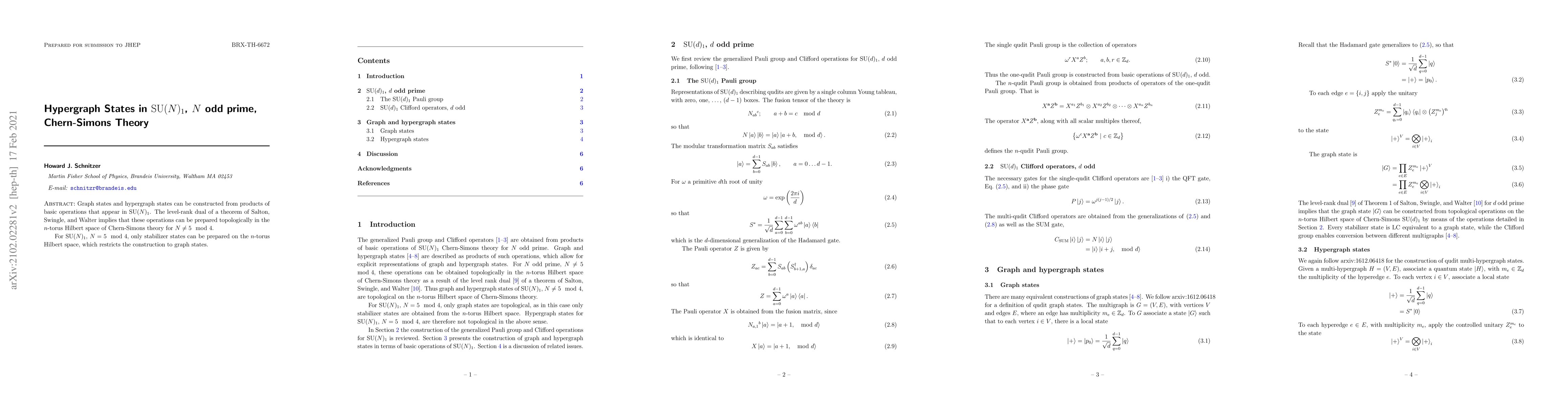 Graph states and hypergraph states can be constructed from products of basic operations that appear in SU(N)1. The level-rank dual of a theorem of Salton, Swingle, and Walter implies that these operations can be prepared topologically in the n-torus Hilbert space of Chern-Simons theory for N neq 5 mod 4. For SU(N)1, N = 5 mod 4, only stabilizer states can be prepared on the n-torus Hilbert space, which restricts the construction to graph states.