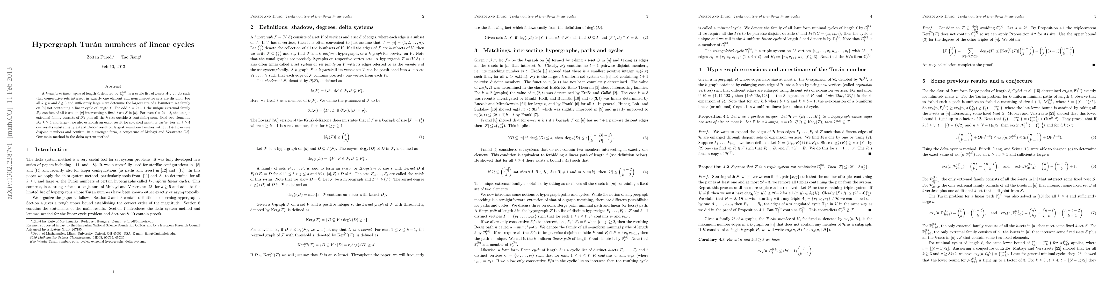 A k-uniform linear cycle of length s is a cyclic list of k-sets A_1,..., A_s such that consecutive sets intersect in exactly one element and nonconsecutive sets are disjoint. For all k at least 5 and s at least 3 and sufficiently large n we determine the largest size of a k-uniform set family on [n] not containing a linear cycle of length s. For odd s=2t+1 the unique extremal family F_S consists of all k-sets in [n] intersecting a fixed t-set S in [n]. For even s=2t+2, the unique extremal family consists of F_S plus all the k-sets outside S containing some fixed two elements. For k at least 4 and large n we also establish an exact result for so-called minimal cycles. For all k at least 4 our results substantially extend Erdos' result on largest k-uniform families without t+1 pairwise disjoint members and confirm, in a stronger form, a conjecture of Mubayi and Verstraete. Our main method is the delta system method.