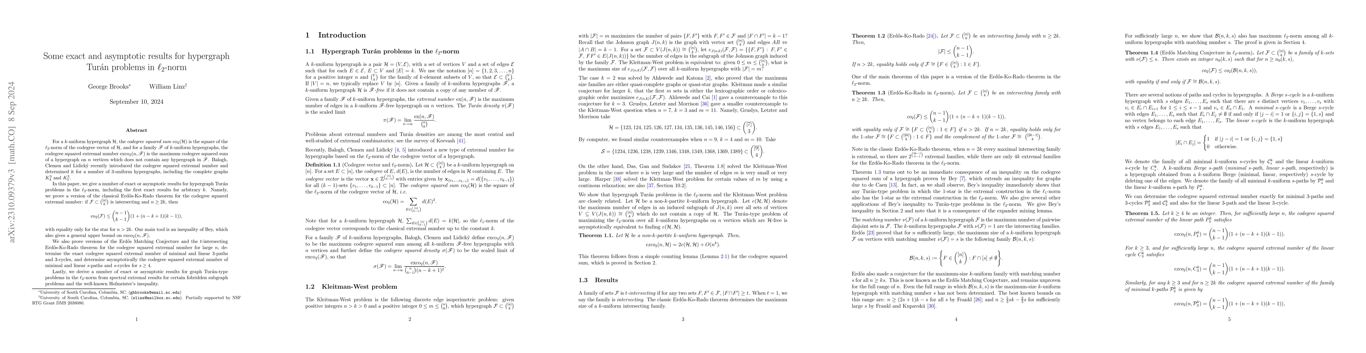 This paper explores the connection between $\ell_2$-norm Turán problems and the Kleitman-West problem, proving a version of the Erdős-Ko-Rado theorem for codegree squared extremal numbers. It also determines extremal numbers for specific hypergraphs and proves related conjectures.