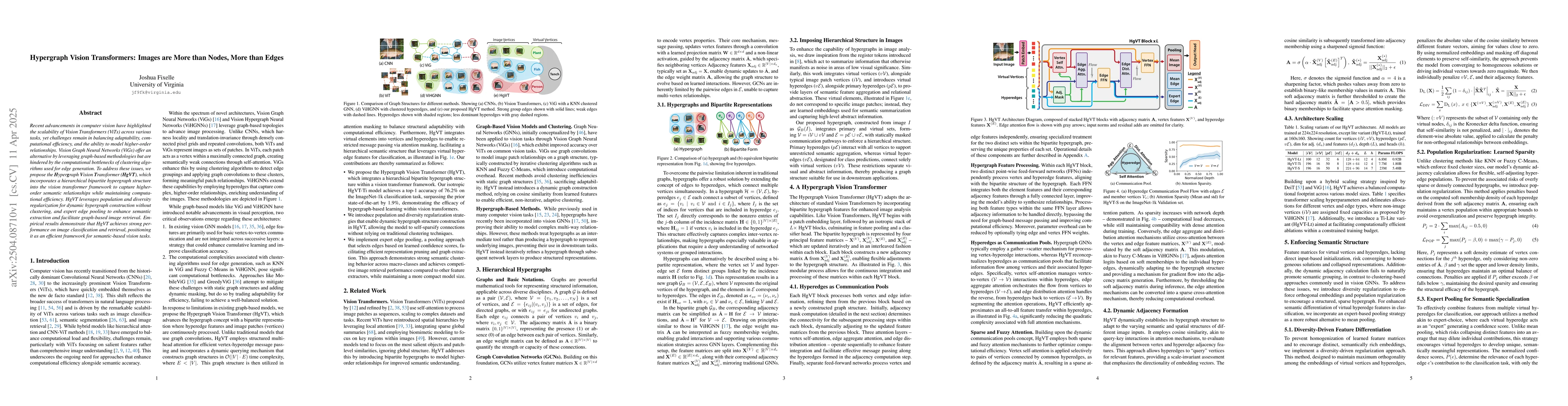 Recent advancements in computer vision have highlighted the scalability of Vision Transformers (ViTs) across various tasks, yet challenges remain in balancing adaptability, computational efficiency, and the ability to model higher-order relationships. Vision Graph Neural Networks (ViGs) offer an alternative by leveraging graph-based methodologies but are hindered by the computational bottlenecks of clustering algorithms used for edge generation. To address these issues, we propose the Hypergraph Vision Transformer (HgVT), which incorporates a hierarchical bipartite hypergraph structure into the vision transformer framework to capture higher-order semantic relationships while maintaining computational efficiency. HgVT leverages population and diversity regularization for dynamic hypergraph construction without clustering, and expert edge pooling to enhance semantic extraction and facilitate graph-based image retrieval. Empirical results demonstrate that HgVT achieves strong performance on image classification and retrieval, positioning it as an efficient framework for semantic-based vision tasks.