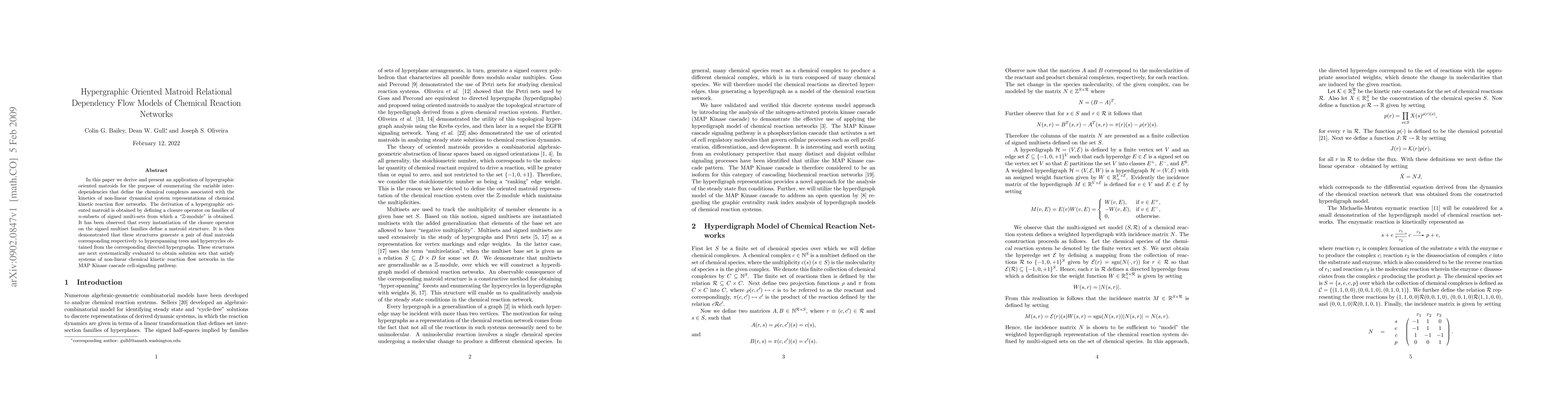In this paper we derive and present an application of hypergraphic oriented matroids for the purpose of enumerating the variable interdependencies that define the chemical complexes associated with the kinetics of non-linear dynamical system representations of chemical kinetic reaction flow networks. The derivation of a hypergraphic oriented matroid is obtained by defining a closure operator on families of n-subsets of signed multi-sets from which a "Z-module" is obtained. It has been observed that every instantiation of the closure operator on the signed multiset families define a matroid structure. It is then demonstrated that these structures generate a pair of dual matroids corresponding respectively to hyperspanning trees and hypercycles obtained from the corresponding directed hypergraphs. These structures are next systematically evaluated to obtain solution sets that satisfy systems of non-linear chemical kinetic reaction flow networks in the MAP Kinase cascade cell-signaling pathway.