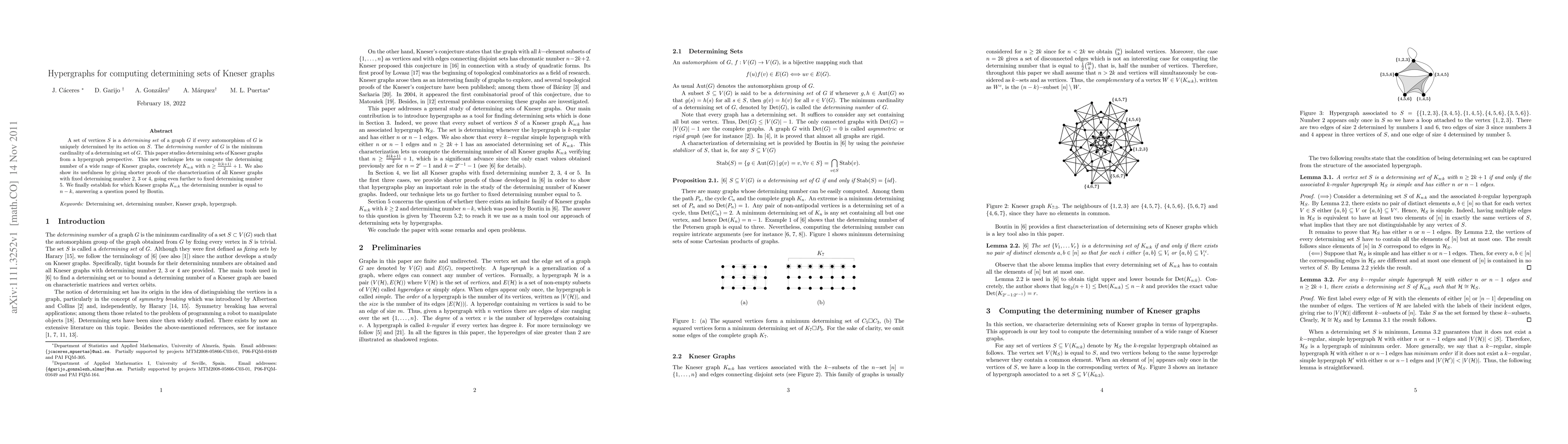 This paper introduces hypergraph techniques to compute determining sets of Kneser graphs, enabling the calculation of determining numbers for a wide range of graphs and providing new insights into their properties.