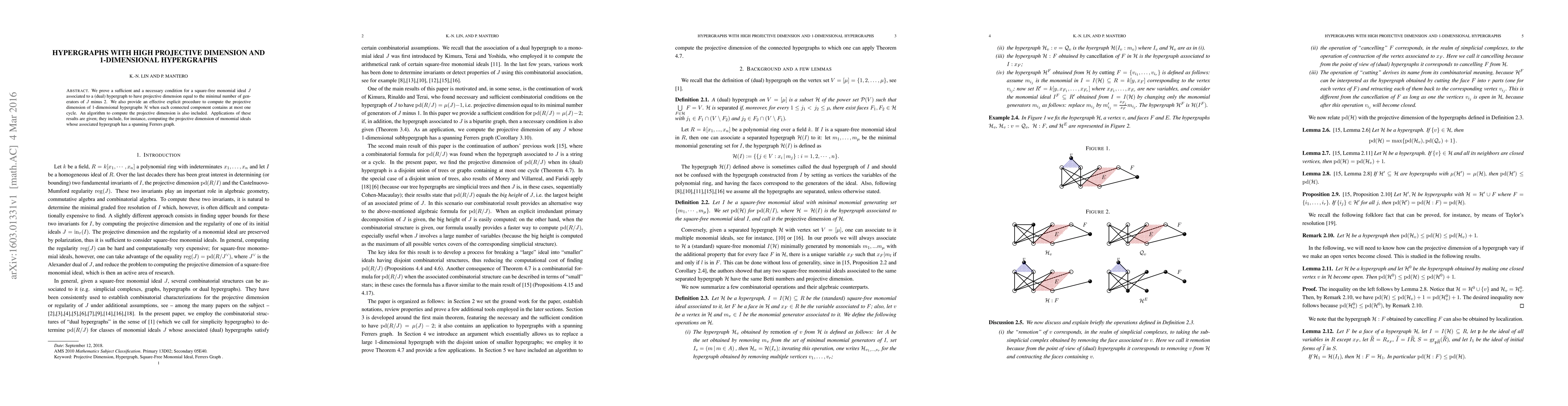This paper establishes conditions for square-free monomial ideals linked to hypergraphs to have a projective dimension equal to two less than the number of generators. It also provides an algorithm to compute the projective dimension for 1-dimensional hypergraphs with limited cycles and applies these findings to monomial ideals associated with spanning Ferrers graphs.