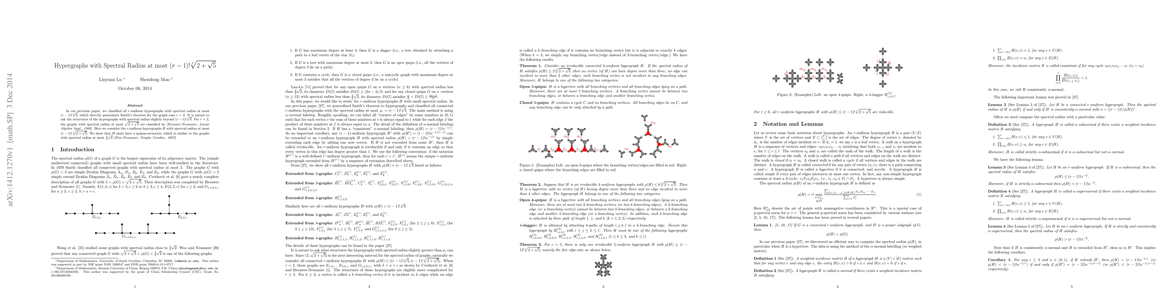 In our previous paper, we classified all $r$-uniform hypergraphs with spectral radius at most $(r-1)!\sqrt[r]{4}$, which directly generalizes Smith's theorem for the graph case $r=2$. It is nature to ask the structures of the hypergraphs with spectral radius slightly beyond $(r-1)!\sqrt[r]{4}$. For $r=2$, the graphs with spectral radius at most $\sqrt{2+\sqrt{5}}$ are classified by [{\em Brouwer-Neumaier, Linear Algebra Appl., 1989}]. Here we consider the $r$-uniform hypergraphs $H$ with spectral radius at most $(r-1)!\sqrt[r]{2+\sqrt{5}}$. We show that $H$ must have a quipus-structure, which is similar to the graphs with spectral radius at most $\frac{3}{2}\sqrt{2}$ [{\em Woo-Neumaier, Graphs Combin., 2007}].