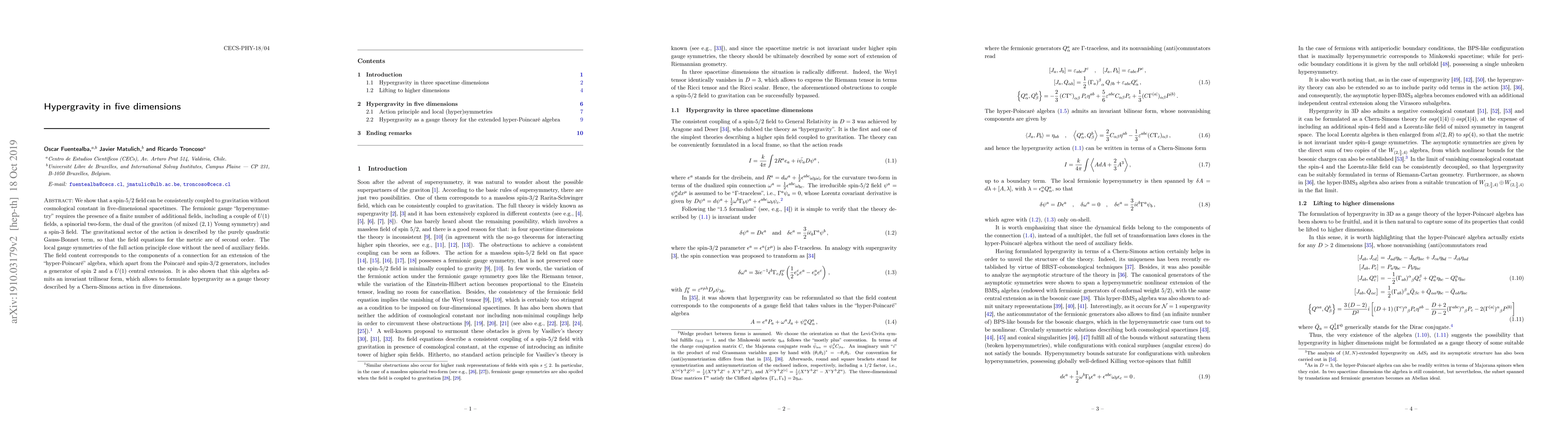 We show that a spin-$5/2$ field can be consistently coupled to gravitation without cosmological constant in five-dimensional spacetimes. The fermionic gauge "hypersymmetry" requires the presence of a finite number of additional fields, including a couple of $U(1)$ fields, a spinorial two-form, the dual of the graviton (of mixed $(2,1)$ Young symmetry) and a spin-$3$ field. The gravitational sector of the action is described by the purely quadratic Gauss-Bonnet term, so that the field equations for the metric are of second order. The local gauge symmetries of the full action principle close without the need of auxiliary fields. The field content corresponds to the components of a connection for an extension of the "hyper-Poincar\'e" algebra, which apart from the Poincar\'e and spin-$3/2$ generators, includes a generator of spin $2$ and a $U(1)$ central extension. It is also shown that this algebra admits an invariant trilinear form, which allows to formulate hypergravity as a gauge theory described by a Chern-Simons action in five dimensions.