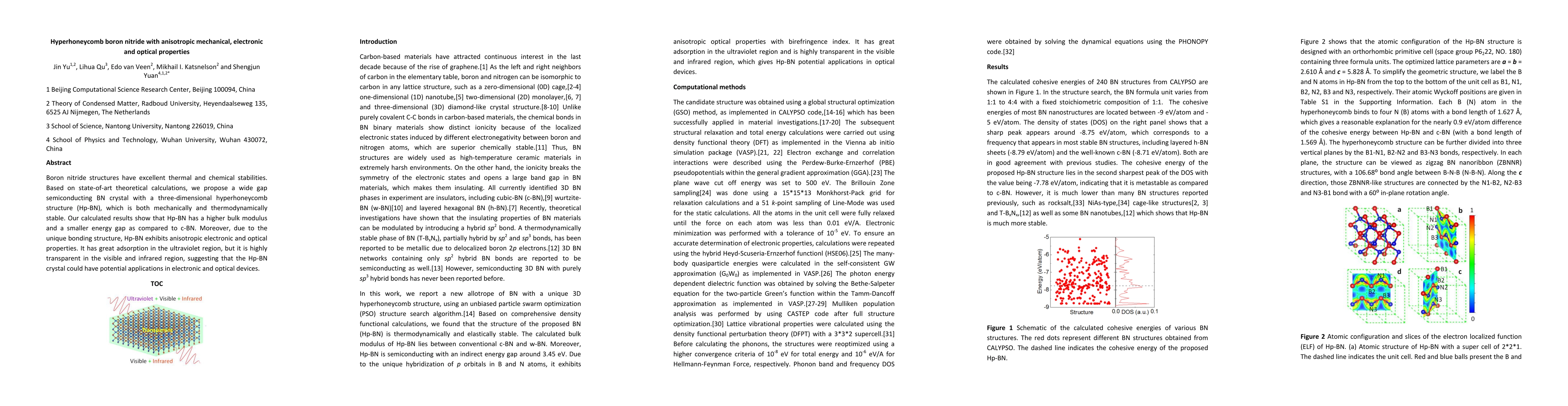This paper proposes a wide-gap semiconducting boron nitride crystal with a hyperhoneycomb structure (Hp-BN) that exhibits superior mechanical stability, higher bulk modulus, and anisotropic electronic and optical properties. Hp-BN shows great potential for applications in electronic and optical devices due to its strong UV adsorption and transparency in visible and infrared regions.