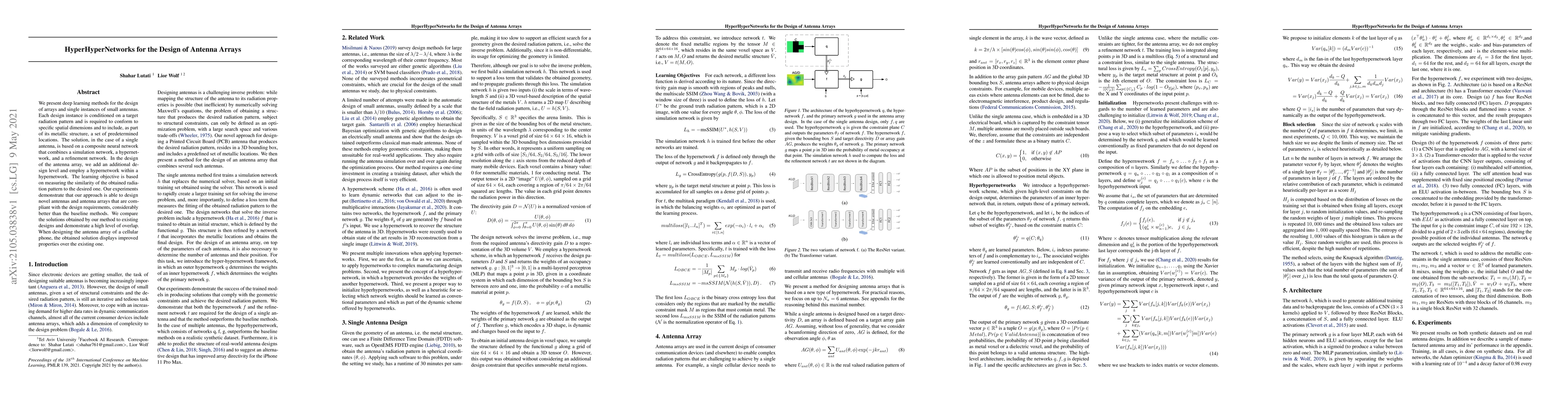 This paper introduces deep learning methods for designing small antennas and antenna arrays, using HyperHyperNetworks to achieve designs that match target radiation patterns while adhering to spatial constraints. Experiments show superior performance compared to baseline methods, especially in cellular phone antenna array design.