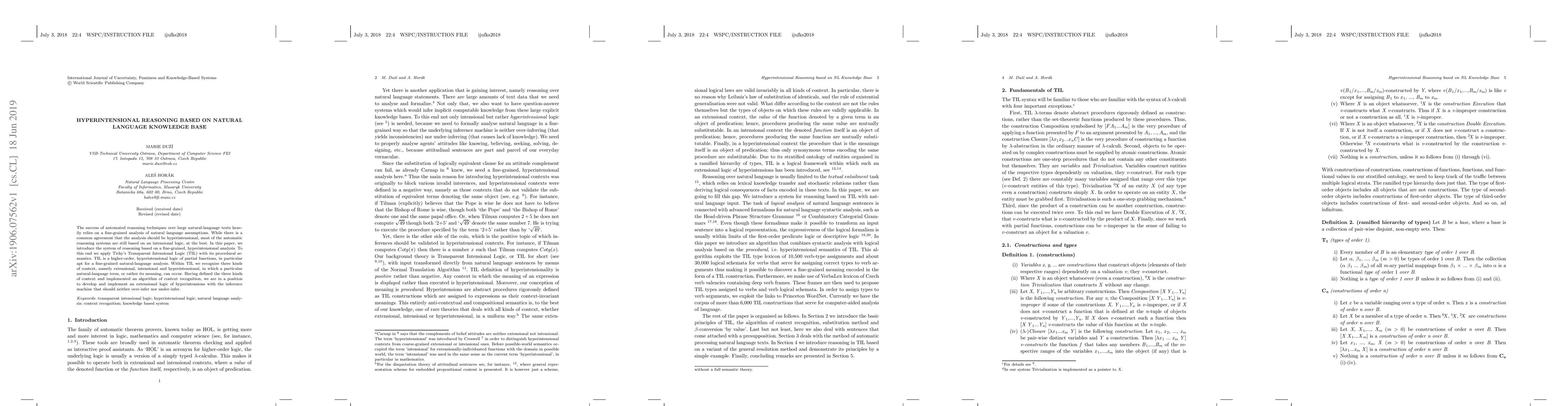 The success of automated reasoning techniques over large natural-language texts heavily relies on a fine-grained analysis of natural language assumptions. While there is a common agreement that the analysis should be hyperintensional, most of the automatic reasoning systems are still based on an intensional logic, at the best. In this paper, we introduce the system of reasoning based on a fine-grained, hyperintensional analysis. To this end we apply Tichy's Transparent Intensional Logic (TIL) with its procedural semantics. TIL is a higher-order, hyperintensional logic of partial functions, in particular apt for a fine-grained natural-language analysis. Within TIL we recognise three kinds of context, namely extensional, intensional and hyperintensional, in which a particular natural-language term, or rather its meaning, can occur. Having defined the three kinds of context and implemented an algorithm of context recognition, we are in a position to develop and implement an extensional logic of hyperintensions with the inference machine that should neither over-infer nor under-infer.