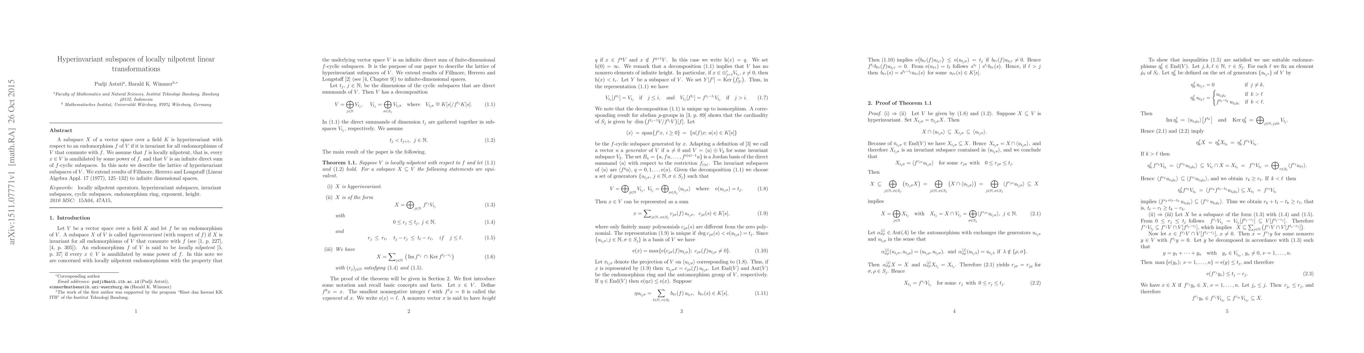 A subspace $X$ of a vector space over a field $K$ is hyperinvariant with respect to an endomorphism $f$ of $V$ if it is invariant for all endomorphisms of $V$ that commute with $f$. We assume that $f$ is locally nilpotent, that is, every $ x \in V $ is annihilated by some power of $f$, and that $V$ is an infinite direct sum of $f$-cyclic subspaces. In this note we describe the lattice of hyperinvariant subspaces of $V$. We extend results of Fillmore, Herrero and Longstaff (Linear Algebra Appl. 17 (1977), 125--132) to infinite dimensional spaces.