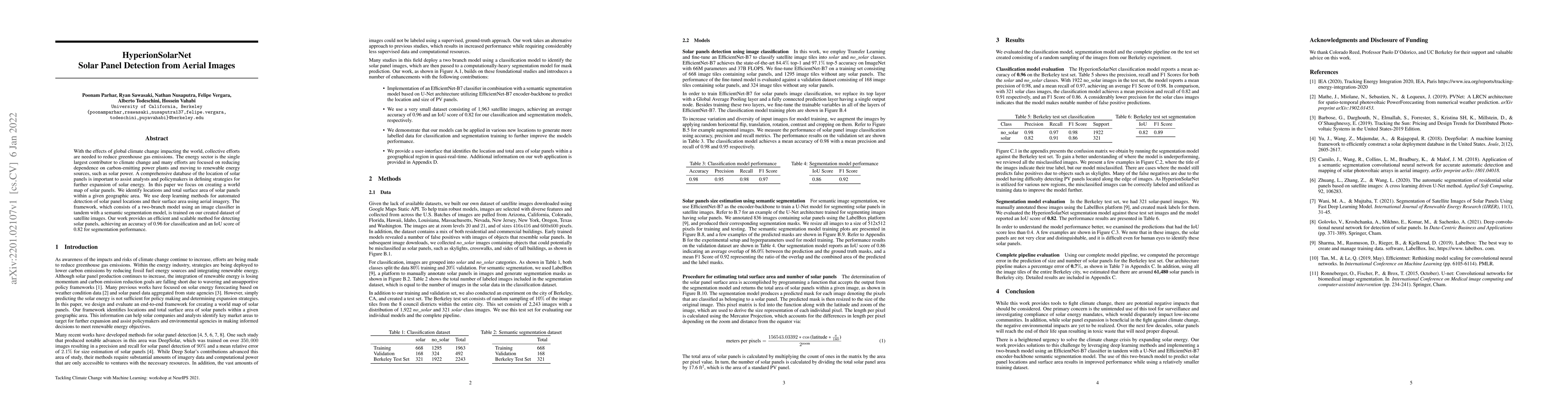 With the effects of global climate change impacting the world, collective efforts are needed to reduce greenhouse gas emissions. The energy sector is the single largest contributor to climate change and many efforts are focused on reducing dependence on carbon-emitting power plants and moving to renewable energy sources, such as solar power. A comprehensive database of the location of solar panels is important to assist analysts and policymakers in defining strategies for further expansion of solar energy. In this paper we focus on creating a world map of solar panels. We identify locations and total surface area of solar panels within a given geographic area. We use deep learning methods for automated detection of solar panel locations and their surface area using aerial imagery. The framework, which consists of a two-branch model using an image classifier in tandem with a semantic segmentation model, is trained on our created dataset of satellite images. Our work provides an efficient and scalable method for detecting solar panels, achieving an accuracy of 0.96 for classification and an IoU score of 0.82 for segmentation performance.