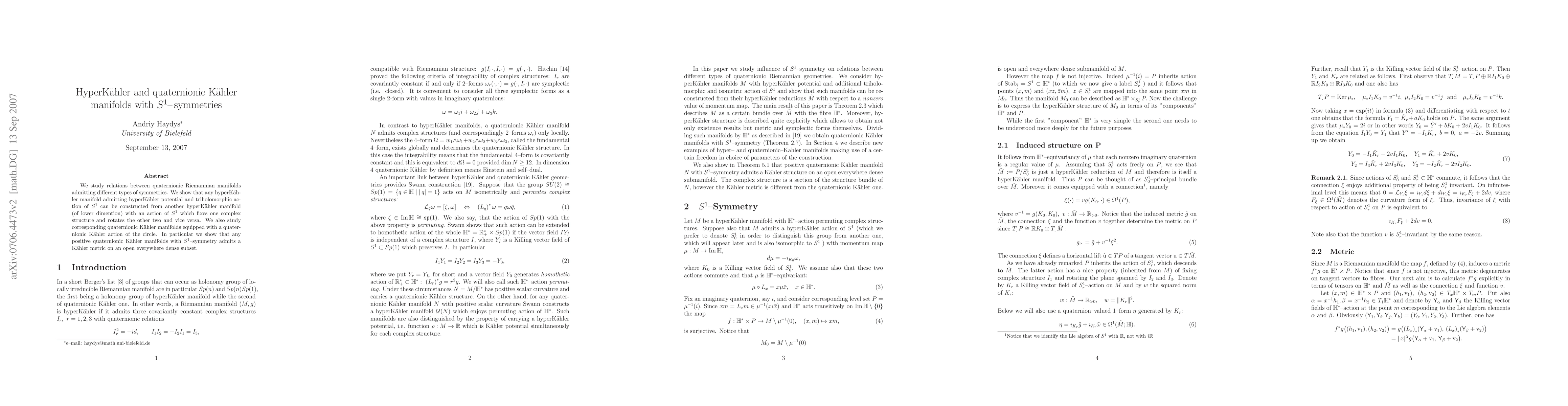 This paper explores connections between quaternionic Riemannian manifolds with specific S^1 symmetries, demonstrating how a hyperKahler manifold with hyperKahler potential and triholomorphic S^1 action can be derived from a lower-dimensional counterpart. It also investigates quaternionic Kahler manifolds with S^1 symmetry, proving that positive quaternionic Kahler manifolds possess a Kahler metric on a dense subset.