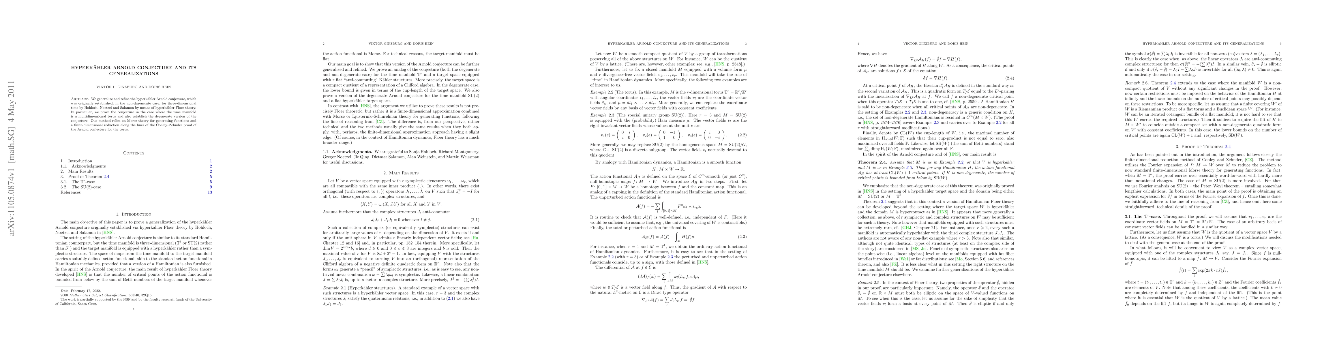 This paper generalizes and refines the hyperkähler Arnold conjecture, proving it for multidimensional tori and establishing the degenerate version. The method employs Morse theory for generating functions and a finite-dimensional reduction akin to the Conley-Zehnder proof for the Arnold conjecture.