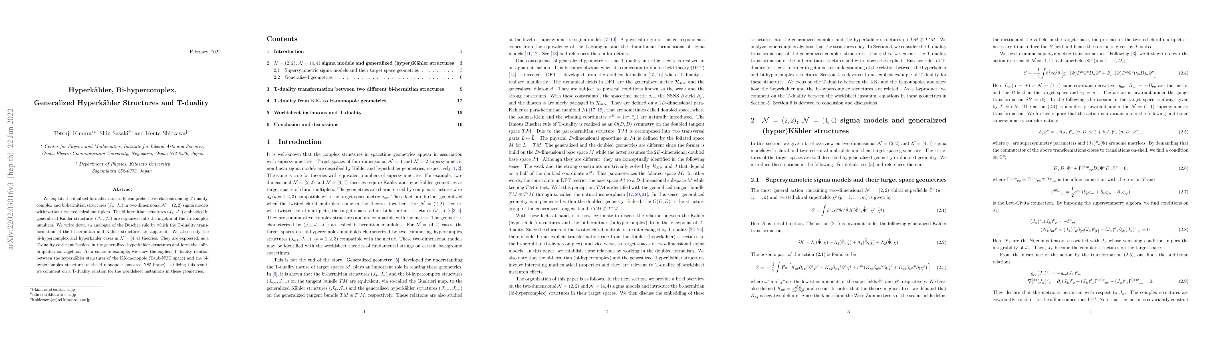 We investigate comprehensive relations among T-duality, complex and bi-hermitian structures $(J_+, J_-)$ in two-dimensional $\mathcal{N} =(2,2)$ sigma models with/without twisted chiral multiplets. The bi-hermitian structures $(J_+,J_-)$ embedded in generalized K\"{a}hler structures $(\mathcal{J}_+,\mathcal{J}_-)$ are organized into the algebra of the tri-complex numbers. We newly write down an analogue of the Buscher rule by which the T-duality transformation of the bi-hermitian and K\"{a}hler structures are apparent. We also study the bi-hypercomplex and hyperk\"{a}hler cases in $\mathcal{N} = (4,4)$ theories. They are expressed, as a T-duality covariant fashion, in the generalized hyperk\"{a}hler structures and form the split-bi-quaternion algebras. As a concrete example, we show the explicit T-duality relation between the hyperk\"{a}hler structures of the KK-monopole (Taub-NUT space) and the bi-hypercomplex structures of the H-monopole (smeared NS5-brane). Utilizing this result, we comment on a T-duality relation for the worldsheet instantons in these geometries.