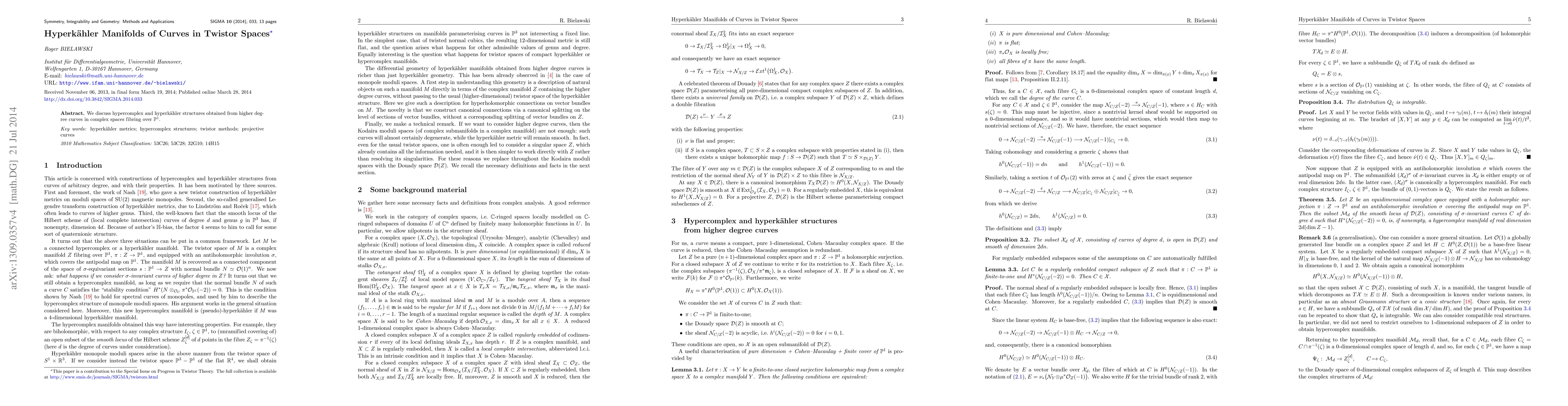 Summary: This paper explores the hypercomplex and hyperkähler structures derived from higher degree curves in complex spaces that fiber over the projective line, focusing on their geometric and topological properties.