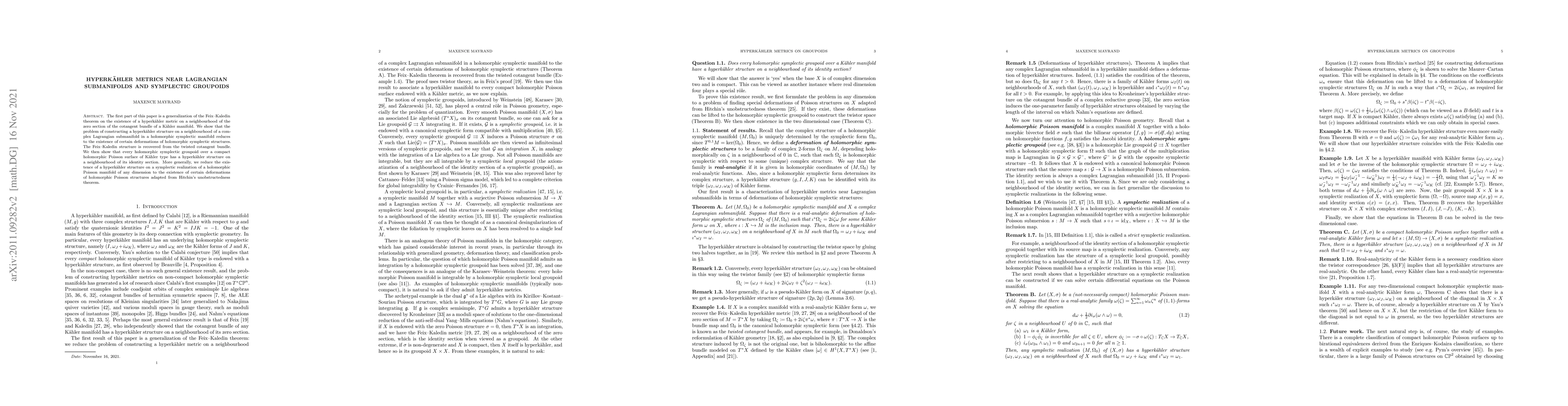 The first part of this paper is a generalization of the Feix-Kaledin theorem on the existence of a hyperkahler metric on a neighbourhood of the zero section of the cotangent bundle of a Kahler manifold. We show that the problem of constructing a hyperkahler structure on a neighbourhood of a complex Lagrangian submanifold in a holomorphic symplectic manifold reduces to the existence of certain deformations of holomorphic symplectic structures. The Feix-Kaledin structure is recovered from the twisted cotangent bundle. We then show that every holomorphic symplectic groupoid over a compact holomorphic Poisson surface of Kahler type has a hyperkahler structure on a neighbourhood of its identity section. More generally, we reduce the existence of a hyperkahler structure on a symplectic realization of a holomorphic Poisson manifold of any dimension to the existence of certain deformations of holomorphic Poisson structures adapted from Hitchin's unobstructedness theorem.