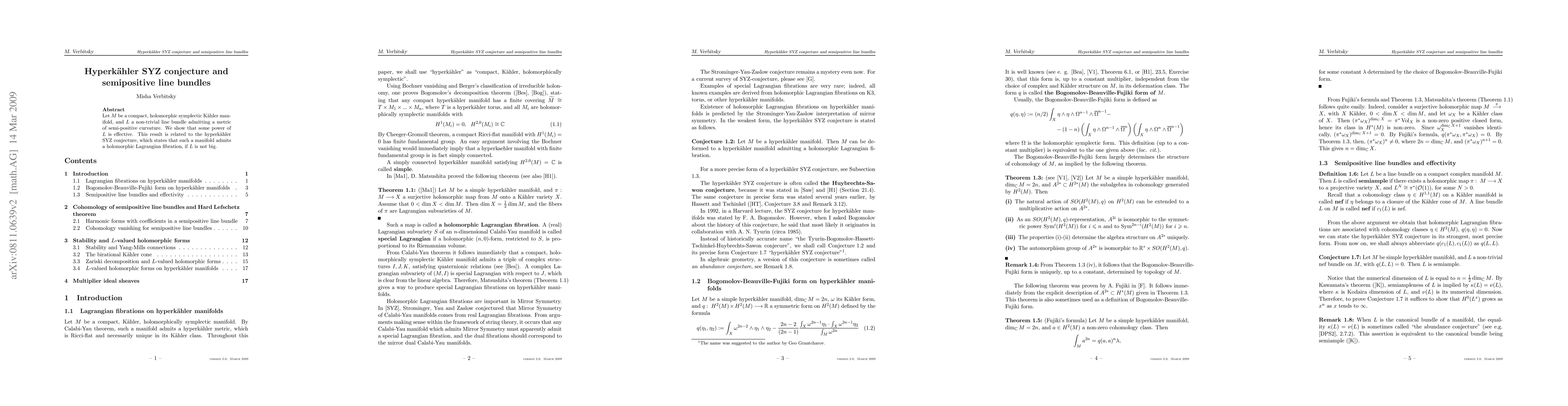 Researchers show that a compact holomorphic symplectic Kaehler manifold with a non-trivial semipositive line bundle admits a holomorphic Lagrangian fibration, related to the hyperkaehler SYZ conjecture.
