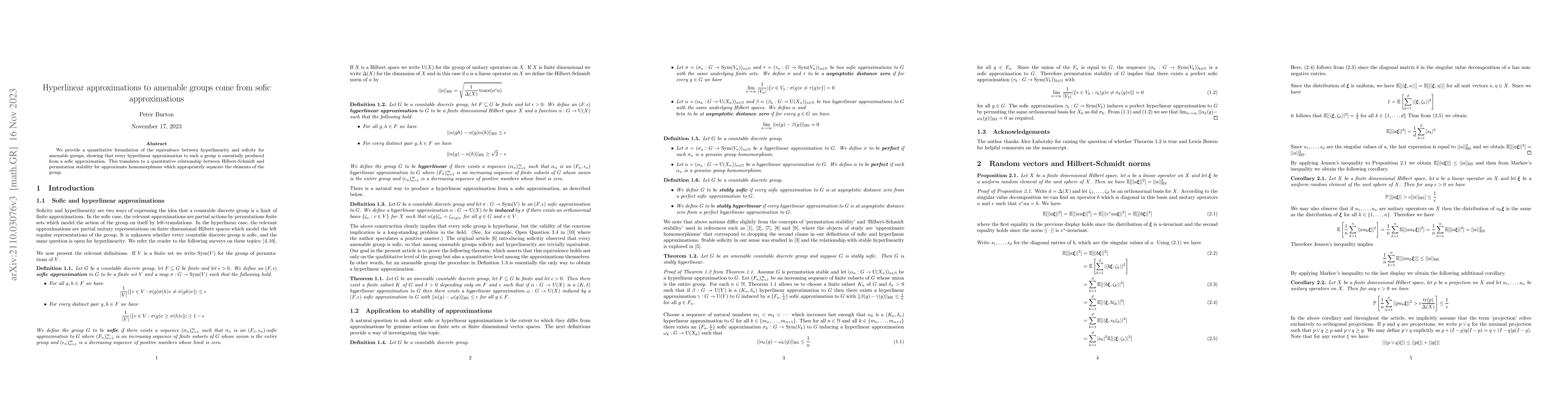 Summary: This paper establishes a quantitative equivalence between hyperlinearity and soficity for amenable groups, demonstrating that any hyperlinear approximation arises from a sofic approximation, thereby linking Hilbert-Schmidt and permutation stability for approximate homomorphisms.
