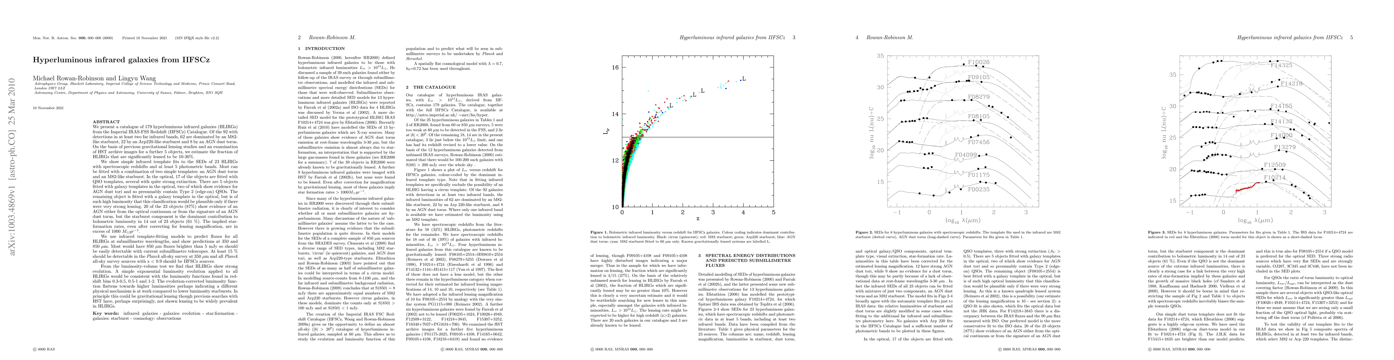 This paper catalogs 179 hyperluminous infrared galaxies (HLIRGs) from the IIFSCz Catalogue, identifying starburst and AGN contributions to their infrared emissions. It estimates that 10-30% of HLIRGs are significantly lensed, and predicts that most will be detectable in submillimetre wavelengths and the Planck survey.