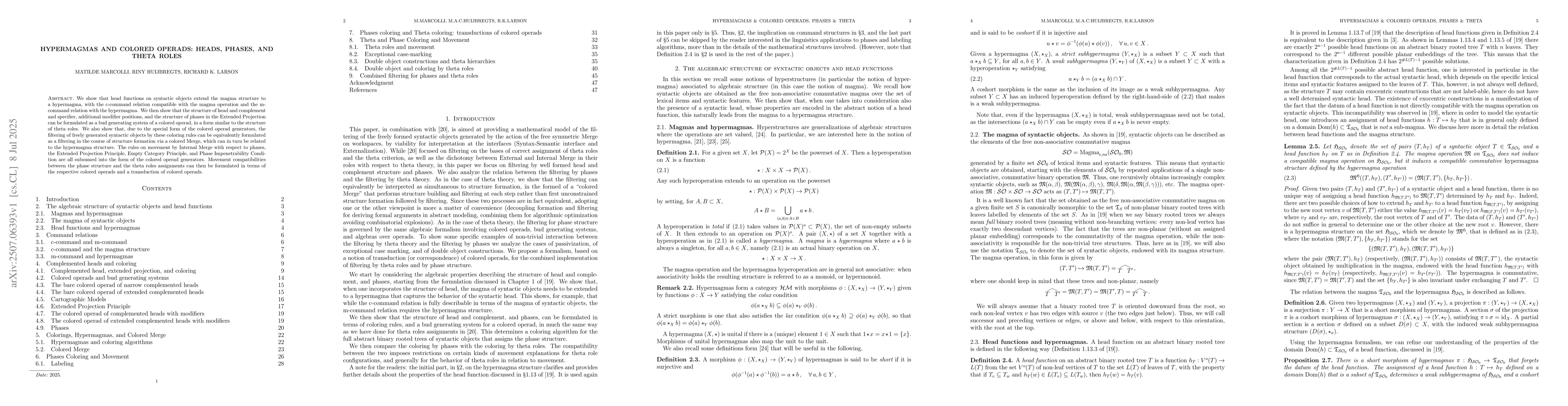 We show that head functions on syntactic objects extend the magma structure to a hypermagma, with the c-command relation compatible with the magma operation and the m-command relation with the hypermagma. We then show that the structure of head and complement and specifier, additional modifier positions, and the structure of phases in the Extended Projection can be formulated as a bud generating system of a colored operad, in a form similar to the structure of theta roles. We also show that, due to the special form of the colored operad generators, the filtering of freely generated syntactic objects by these coloring rules can be equivalently formulated as a filtering in the course of structure formation via a colored Merge, which can in turn be related to the hypermagma structure. The rules on movement by Internal Merge with respect to phases, the Extended Projection Principle, Empty Category Principle, and Phase Impenetrability Condition are all subsumed into the form of the colored operad generators. Movement compatibilities between the phase structure and the theta roles assignments can then be formulated in terms of the respective colored operads and a transduction of colored operads.