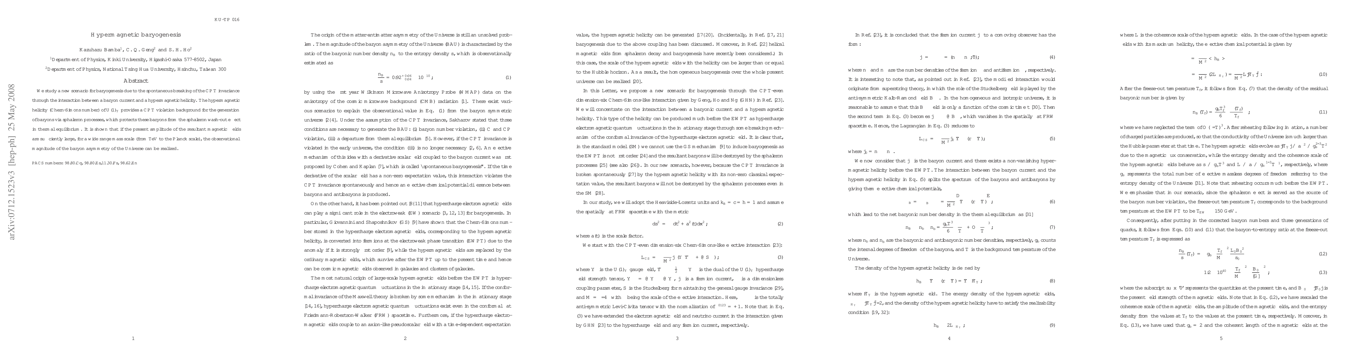 This paper proposes a new mechanism for baryogenesis based on the spontaneous breaking of $CPT$ symmetry through the interaction between a baryon current and hypermagnetic helicity. It demonstrates that a sufficiently large amplitude of magnetic fields can generate the observed baryon asymmetry in the Universe.