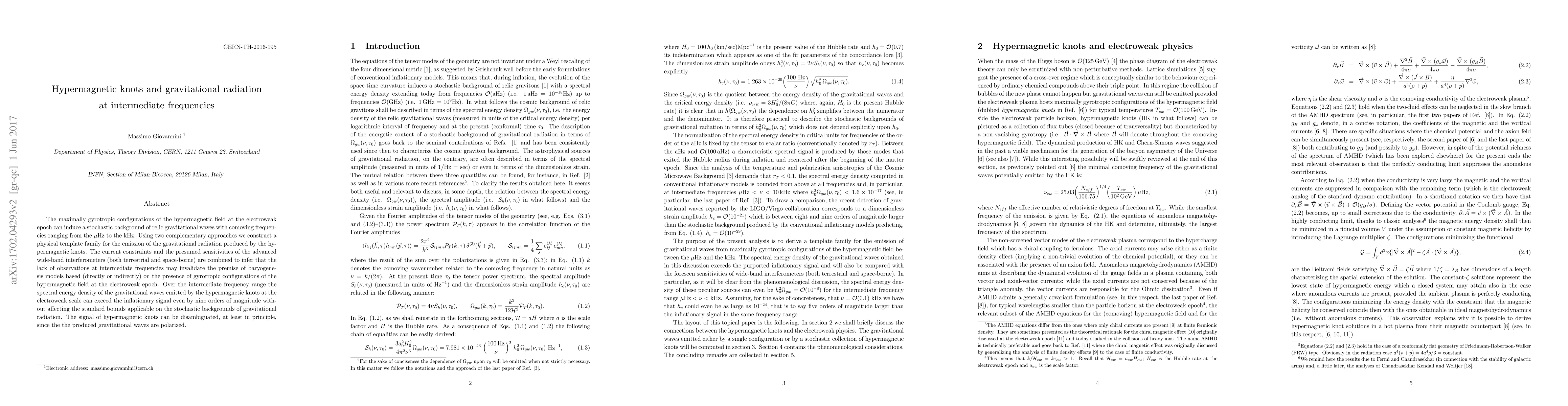 This paper explores the gravitational radiation from hypermagnetic knots at the electroweak epoch, suggesting they could generate a stochastic background of gravitational waves across a wide frequency range. It argues that the absence of intermediate frequency observations may challenge baryogenesis models reliant on hypermagnetic fields, while noting the potential for advanced interferometers to detect these polarized gravitational waves.