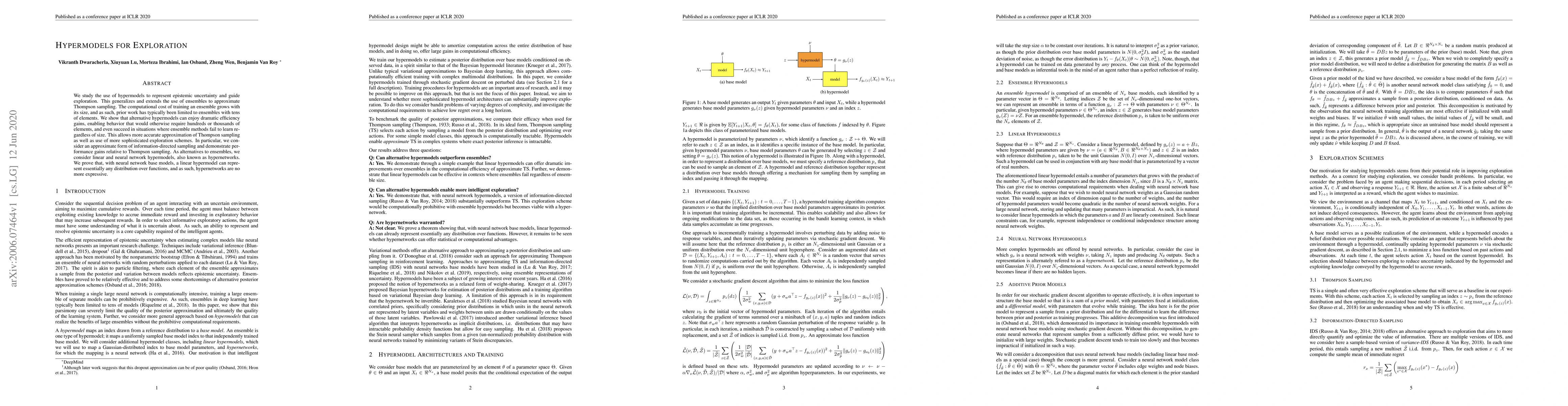 We study the use of hypermodels to represent epistemic uncertainty and guide exploration. This generalizes and extends the use of ensembles to approximate Thompson sampling. The computational cost of training an ensemble grows with its size, and as such, prior work has typically been limited to ensembles with tens of elements. We show that alternative hypermodels can enjoy dramatic efficiency gains, enabling behavior that would otherwise require hundreds or thousands of elements, and even succeed in situations where ensemble methods fail to learn regardless of size. This allows more accurate approximation of Thompson sampling as well as use of more sophisticated exploration schemes. In particular, we consider an approximate form of information-directed sampling and demonstrate performance gains relative to Thompson sampling. As alternatives to ensembles, we consider linear and neural network hypermodels, also known as hypernetworks. We prove that, with neural network base models, a linear hypermodel can represent essentially any distribution over functions, and as such, hypernetworks are no more expressive.